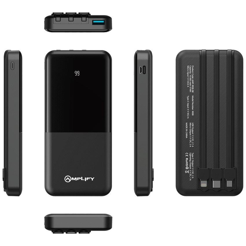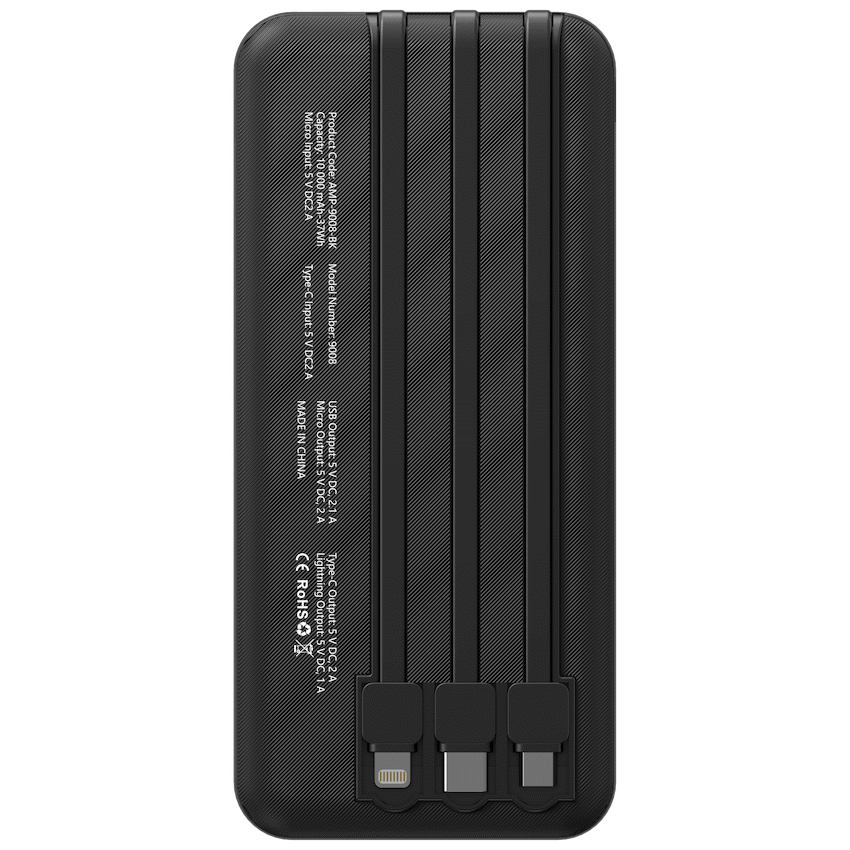 Amplify 10000mAh Power Bank with Integrated Cables – Black
