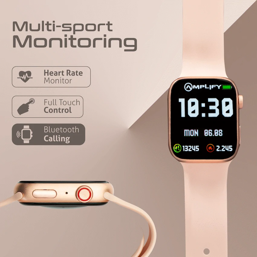 Meet the Amplify Challenge Series Smartwatch, your easy, everyday smartwatch for Android & iPhone that helps you stay active, connected and in control. A bright 2.01″ TFT display makes stats and notifications clear at a glance, while reliable Bluetooth 5.1 keeps everything synced with your phone.Track the basics that matter: continuous heart-rate monitoring, algorithmic blood-oxygen (SpO2) measurement and 9 multi-sport modes for workouts and daily movement. Stay in the loop with call and message notifications, check the weather before you head out, control your music on the go and snap group photos using the remote camera shutter. Wireless charging means fewer cables and an easier top-up. With up to 1-2 days of use when continuously connected via Bluetooth (and up to 3-5 days on standby), it’s ready for your routine.Crafted with a zinc-alloy shell and a soft silicone strap, the Challenge Series balances durability and comfort. Choose from seven built-in watch faces to match your mood.
