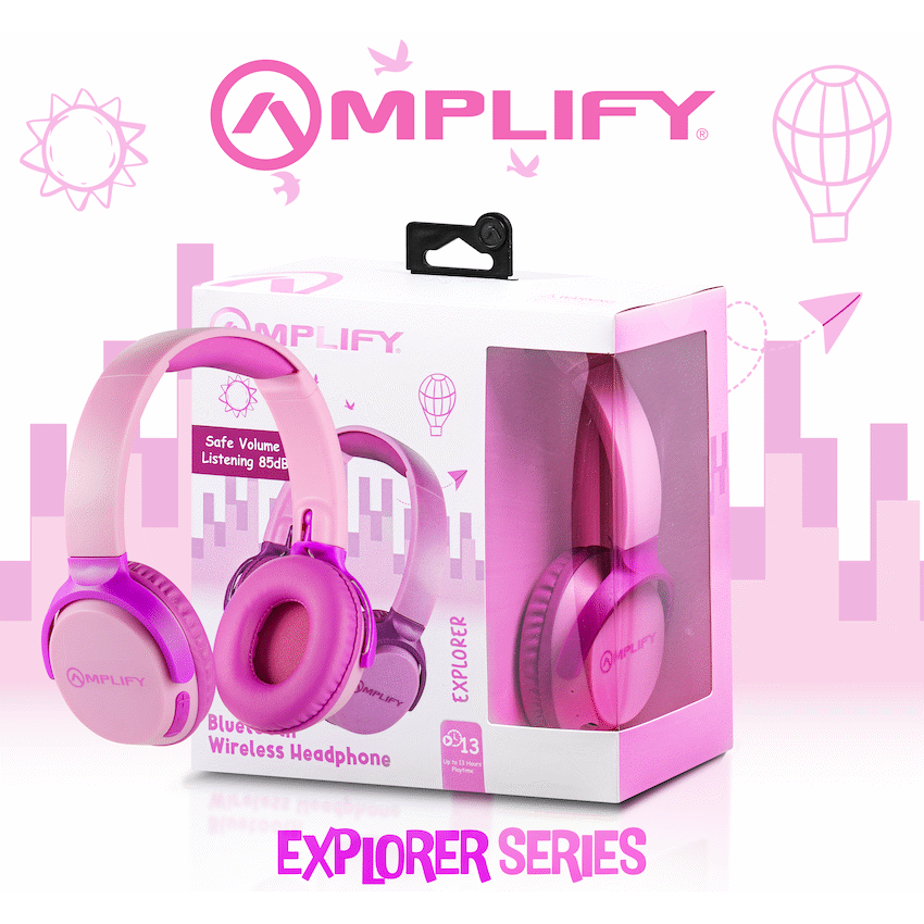 Give your child the freedom to enjoy music, learning, or calls safely with the Amplify Explorer Series Bluetooth Headphones. Designed with comfort and safety in mind, these headphones feature an 85dB volume limiter to protect young ears while still delivering clear, engaging sound. Whether it’s for school, online learning, or downtime entertainment, these wireless headphones make the perfect companion.Enjoy up to 13 hours of playtime on a single charge-enough for a full day of learning and fun. The built-in microphone makes it easy for kids to participate in classes or stay in touch with friends and family. Thanks to the comfortable swivel earcups and adjustable fit, they’re made for all-day wear. Plus, with wired or wireless flexibility, these headphones work even when the battery runs low.Feature Highlights:Kid-Safe Volume Limit – Max 85dB for safe, worry-free listeningAll-Day Wireless Playtime – Up to 13 hours on a single chargeBuilt-In Mic – Perfect for online classes, chats, or callsWired or Wireless Use – Switch between Bluetooth or 3.5mm audio jackSwivel Earcups – Designed for comfort and easy storageDurable Build – Lightweight, with ABS & PU leather constructionTechnical Specifications:Bluetooth Version: 5.3Chipset: JL7003Bluetooth Distance: 10mDriver Size: 40mmImpedance: 32?Frequency Range: 20Hz – 20kHzSensitivity: 85 +/- 3 dBBattery Capacity: 150mAhCharging Time: 2 HoursPlaytime (50% Volume): 13 HoursCharging Port: USB Type-CCharging Input: 5V ? 1AWhat’s in the Box:Amplify Explorer Bluetooth Wireless HeadphoneUSB-C Charging Cable3.5mm Audio Jack CableInstruction ManualStay connected, safe, and comfortable-whether it’s time to learn or play