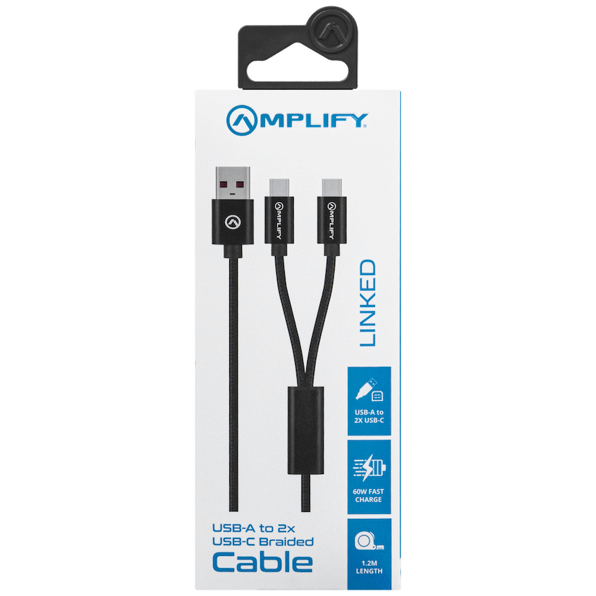 Amplify Linked Series USB to 2 x USB-C Braided Cable 60W 1.2m – Black