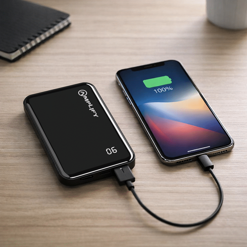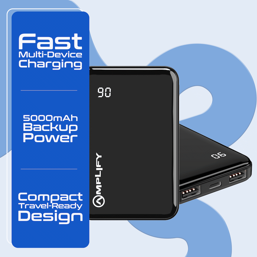 Stay charged in style with the Amplify 5000mAh Power Bank, featuring a sleek glossy finish and dependable performance in a compact design. Perfect for keeping your devices powered up wherever you go