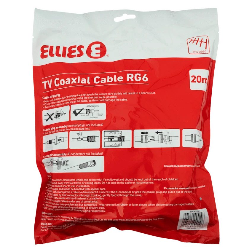 The Ellies 20m Coaxial Cable AC5C is designed to deliver reliable audio and video signal transfer for your TV, decoder, or DSTV setup. With its extended 20-metre length, this coaxial cable 20m gives you the flexibility to connect devices across rooms or neatly route cables without compromising on quality.Built by Ellies, South Africa’s trusted brand in electronics accessories, this cable ensures stable analogue transmission so you can enjoy uninterrupted picture and sound. Whether you’re extending your DSTV installation, upgrading your home theatre setup, or replacing an old cable, the Ellies coax cable is built to last and perform.