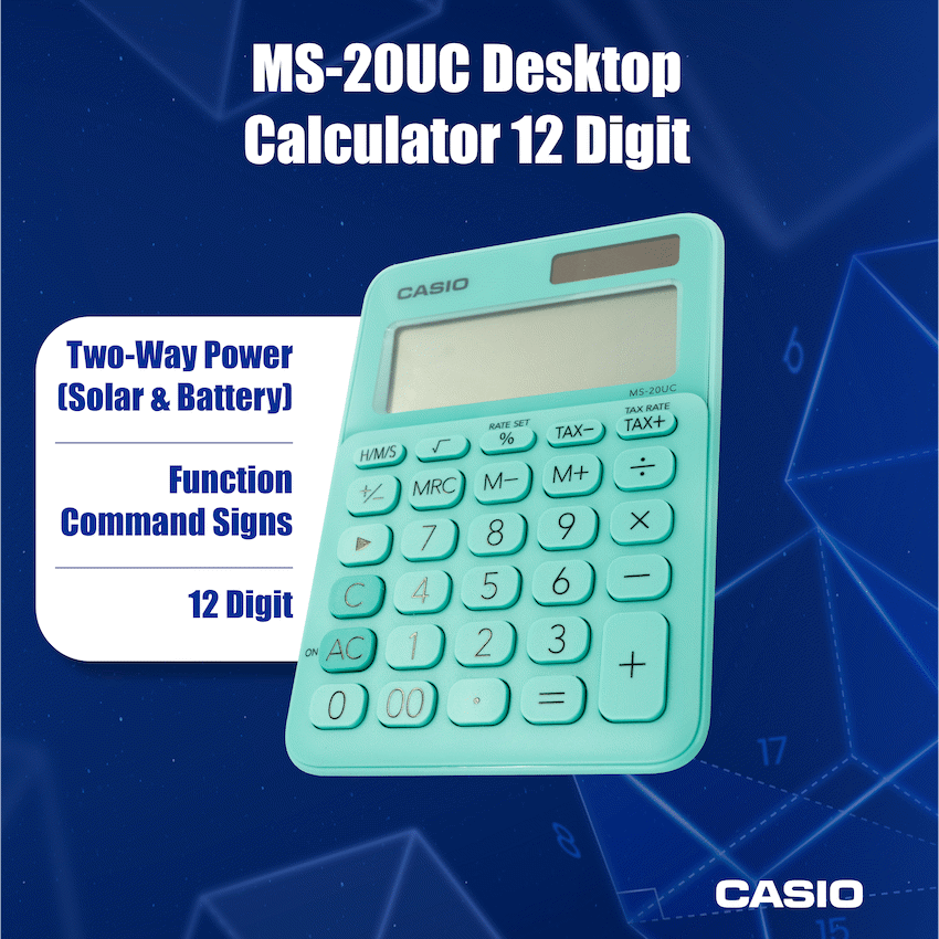 The Casio MS-20UC Desktop Calculator is a versatile and practical tool designed for everyday office, business, and home use. With its 12-digit extra-large display, calculations are clear and easy to read, reducing errors during work. It comes equipped with essential functions including tax calculation, time calculation, and profit margin percentage, making it ideal for financial and accounting tasks. The function command signs provide clear input guidance, while the key rollover function ensures accurate entry even when keys are pressed quickly. Powered by a two-way system (solar and battery), it guarantees reliable performance in all lighting conditions. Compact yet efficient, this calculator measures 105(W) x 149.5(D) x 22.8(H)mm, making it the perfect size for any desk.
