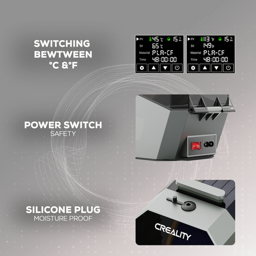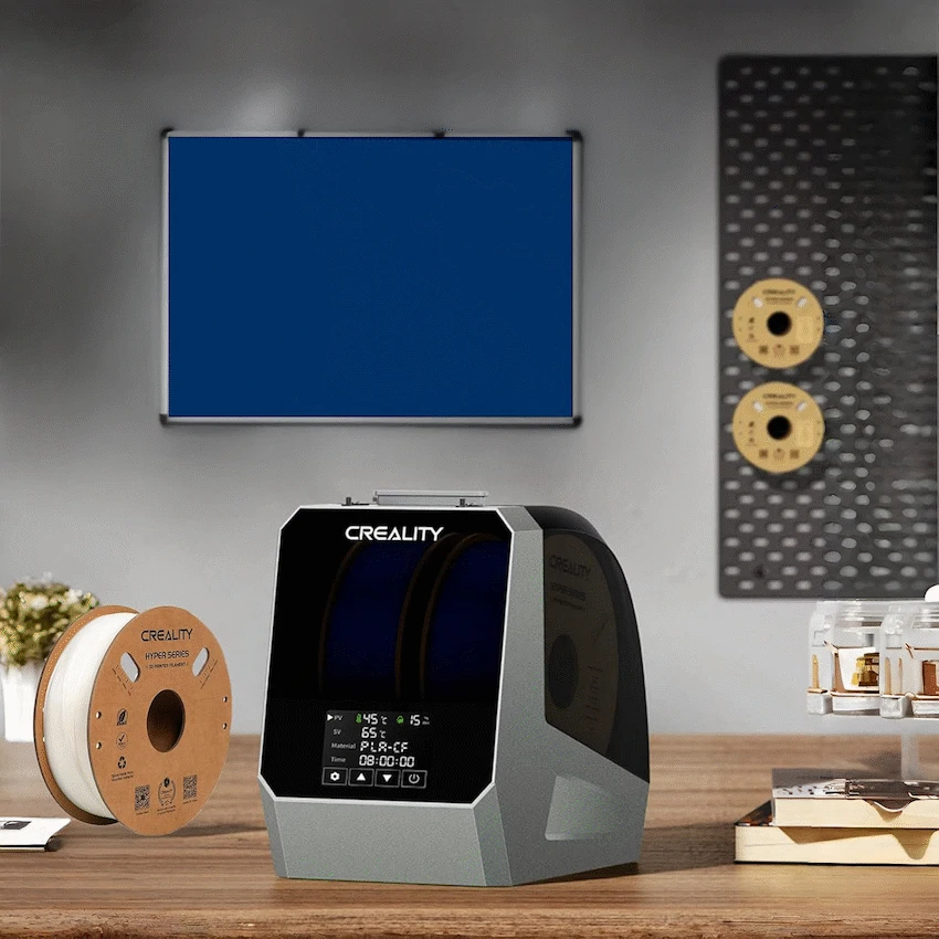 Level up your filament management with the Creality Space Pi Filament Dryer Plus-a high-capacity, dual-spool drying station designed for efficiency, precision, and convenience. Whether you’re drying PLA, ABS, PETG, TPU, or specialty materials, this smart dryer delivers consistent results with minimal effort.Equipped with energy-efficient PTC 360deg hot-air heating, the unit rapidly and uniformly removes moisture from both filament rolls, keeping them print-ready whenever you need. The intuitive one-key preset system includes profiles for 12 common filament types, while a responsive LCD touch screen lets you adjust temperature (45-70?degC), set drying time (up to 48 hours), and monitor humidity and temperature in real time. Plus, the power-off memory feature ensures your settings are saved even during interruptions-perfect for uninterrupted filament care.Compact yet powerful, this dryer fits snugly into any 3D printing workspace-providing reliable drying and storage for multiple printers or high-demand sessions.