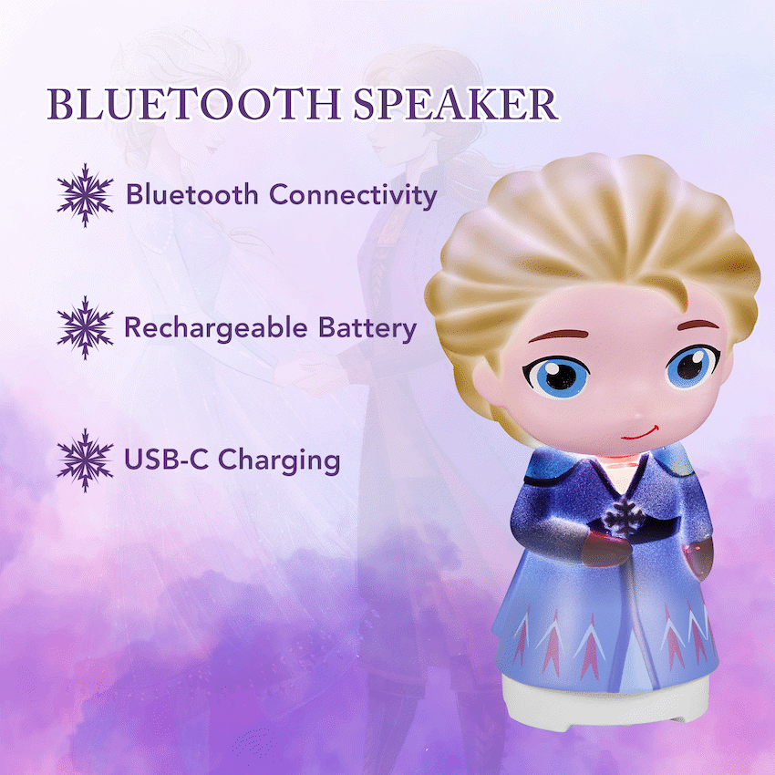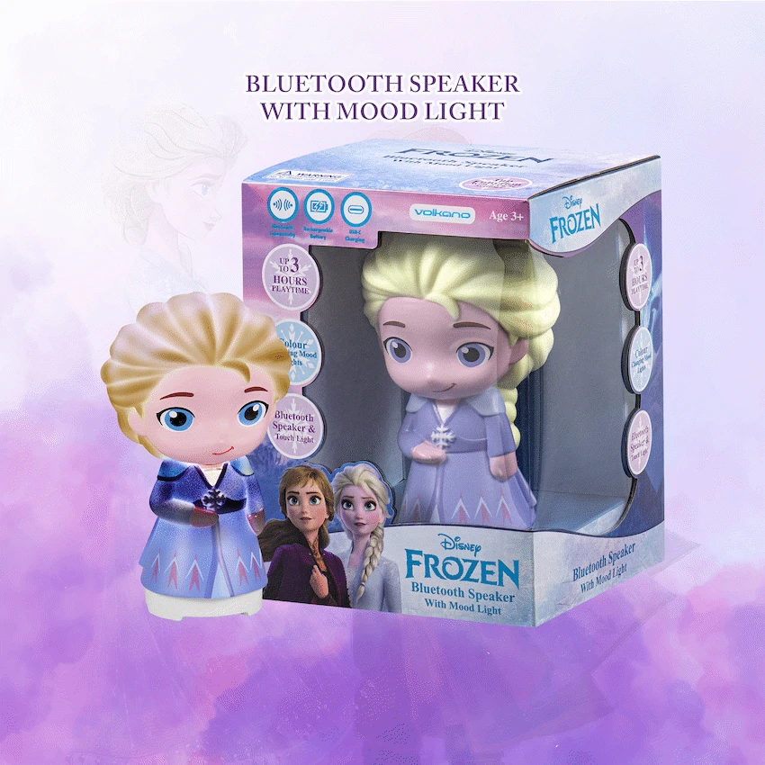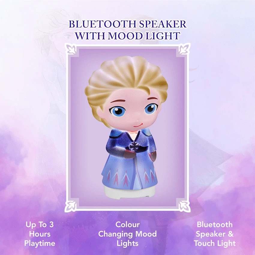 Bring a little Disney magic into your child’s world with the Disney Frozen Bluetooth Speaker with Mood Light. This fun and functional device combines quality audio with a glowing light feature, creating the perfect companion for storytime, bedtime, or playtime. Whether you’re playing your little one’s favourite Frozen soundtrack or soothing lullabies, the wireless convenience and soft ambient lighting add charm to any space.With Bluetooth 5.3, you can enjoy seamless wireless streaming from up to 10 metres away, while the built-in rechargeable battery delivers up to 3 hours of uninterrupted sound. The touch-sensitive light offers three calming modes-slow flash, quick flash, or a single glowing colour-making it an ideal mood-setter for young fans of Elsa and Anna.Feature HighlightsFrozen-Themed Design – Delightful character-inspired look perfect for any Disney fanMood Light with Touch Control – Choose from slow flash, quick flash, or a steady glowWireless Bluetooth Streaming – Stream music effortlessly from smartphones or tabletsUp to 3 Hours of Playtime – Enjoy extended listening on a single chargeRechargeable Battery – Eco-friendly and cost-saving built-in 300mAh batteryCompact & Lightweight – Ideal size for kids’ rooms, travel or giftingTechnical SpecificationsBluetooth Version: 5.3Range: 10mBattery: 3.7V ? 300mAhCharging Time: 2 HoursPlaytime: 2-3 HoursFrequency Response: 80Hz – 100kHzRMS Power Output: 1 x 3W, 4?Signal-to-Noise Ratio: 80dBSensitivity: 75dBMaterial: ABSTouch Light Modes: Slow Flashing, Quick Flashing & Single ColourWhat’s in the BoxDisney Frozen Touch Light with Bluetooth SpeakerUSB-C Charging CableInstruction ManualLet your child sing, glow, and dream with their favourite Frozen characters-the perfect blend of sound and soft light for magical moments every day.