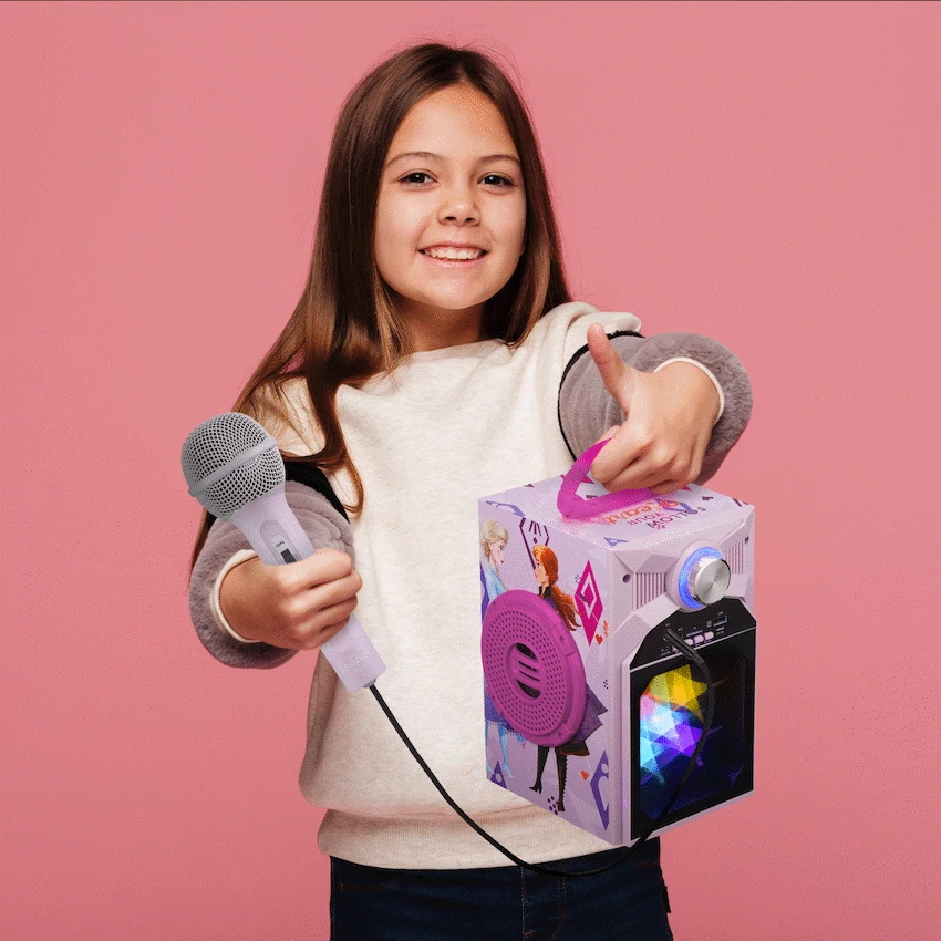 Turn any room into a magical stage with the Frozen karaoke machine every little star dreams of. The Disney Frozen Classic LED Stars Karaoke Machine with Microphone delivers the ultimate performance setup for kids who love to sing, dance, and shine. Packed with exciting features like Bluetooth streaming, a built-in FM radio, multicolour LED lights, and multiple playback options, this is a party in a box!Whether they’re belting out their favourite Disney hits or freestyling their own songs, this kids Bluetooth karaoke speaker brings music to life with powerful 10W sound and a wired microphone included. It’s designed with dazzling light displays and supports USB, SD card, and Aux inputs for endless entertainment options. And with a rechargeable battery, there’s no need to keep buying AAs-just charge up and go!Perfect for birthday parties, family gatherings, or solo singalongs, this Disney karaoke machine with lights combines style, sound, and portability in one Frozen-themed package that kids will adore.Feature Highlights:Wireless Singing with Bluetooth – Stream music directly from your phone or tabletDazzling LED Light Show – Multicolour lights dance along with your musicPlay Music via USB, SD, or Aux – Enjoy flexible playback optionsBuilt-in FM Radio – Tune into favourite local stations anytimeRechargeable for Hours of Play – No batteries needed-just charge and singPowerful 10W Sound Output – Dual speakers deliver rich, room-filling audioIncludes Wired Microphone – Plug in and start performing right awayTechnical Specifications:Bluetooth Version: V5.3Bluetooth Range: 10mBattery: 3.7V, 1200mAhCharging Time: 3-4 HoursPlayback Time: 2-4 Hours (Depending on Volume)USB/SD Card Support: Up to 32GBPower Supply: DC 5V 1AFrequency Response: 100Hz-20kHzTotal RMS Output: 10W (2 x 5W Speakers)Impedance: 3?Sensitivity: 90dBProduct Size: 180 x 160 x 257 mmWhat’s in the Box:Disney Frozen Classic LED Stars Karaoke MachineDisney Frozen Wired MicrophoneAuxiliary CableUSB Charging CableInstruction ManualGive your little one the gift of musical magic with this children’s karaoke set with microphone-perfect for hours of Frozen fun, anytime, anywhere!