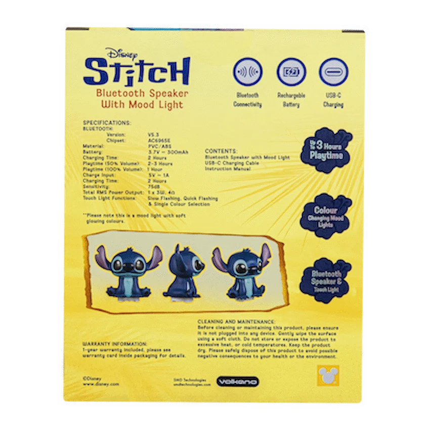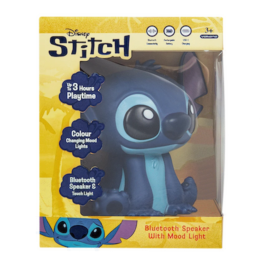 Bring the magic of Disney into your space with the Stitch Bluetooth Speaker with Mood Light. This adorable and compact speaker features everyone’s favourite blue alien, combining character charm with modern tech. Whether you’re playing your favourite playlist or setting the mood with soft glowing colours, it’s the perfect companion for bedrooms, desks, or even your next themed party.Featuring Bluetooth 5.3, this speaker ensures a stable, wireless connection up to 10 metres, making streaming seamless from your phone or tablet. The built-in touch-controlled mood light offers multiple lighting modes-slow flashing, quick flashing, or a single colour-to match your vibe. Despite its cute design, this speaker delivers clear sound through a 3W RMS output, and it’s rechargeable for up to 3 hours of playtime on a single charge.Whether it’s for a Disney fan, a child’s gift, or just something fun for your space, this speaker brings joyful tunes and ambient lighting together in one neat package.Feature Highlights:Bluetooth 5.3 Connectivity – Enjoy a stable wireless range of up to 10 metresBuilt-in Mood Light – Touch control lets you cycle through glowing light modes3 Hours Playtime – Rechargeable battery keeps the fun going for longerCompact & Adorable Design – Perfect for desks, bedrooms, or themed partiesClear Audio Output – 3W RMS power delivers crisp, quality soundTechnical Specifications:Bluetooth Version: V5.3Chipset: AC6965EProfiles: A2DP / AVCTPRange: 10mBattery: 3.7V ? 300mAhPlaytime: 2-3 HoursCharging Time: 2 HoursCharge Input: 5V ? 1AFrequency Response: 80Hz – 100kHzRMS Power Output: 3W (4?)SNR: 80dBSensitivity: 75dBMaterial: ABSWhat’s in the Box:Stitch Bluetooth Speaker with Soft Mood LightUSB-C Charging CableInstruction Manual