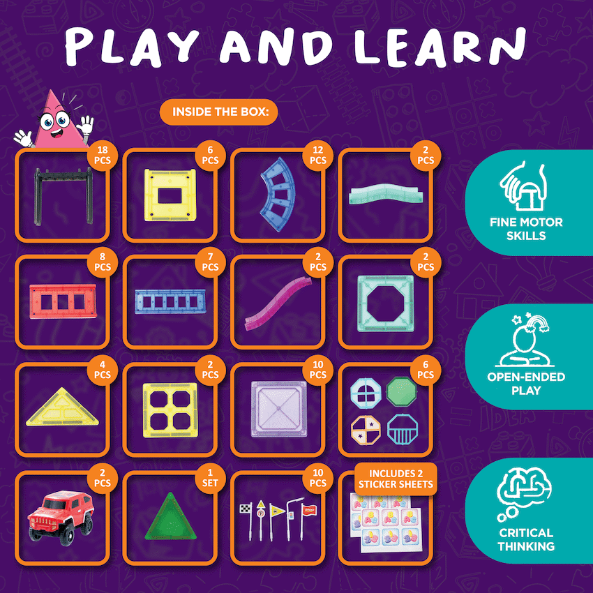 The Edu-matic Mini-Mag Magnetic Tile Tracks Set is an exciting all-in-one play kit that combines creativity, construction, and fun for children of all ages. With 93 pieces in total, this set includes 37 track pieces that can be assembled into different layouts, along with 20 magnetic tiles to build a colourful city around the tracks. To bring the setup to life, it comes with 2 battery-operated cars (AA powered) that run smoothly on the tracks, adding action and excitement to playtime. The kit also features 10 road signs and stickers, helping kids design a realistic city environment while learning about traffic rules and urban planning. Designed to inspire hours of open-ended play, this set encourages creativity, problem-solving, and fine motor skills while strengthening imagination. Perfect for group play or solo fun, the Edu-matic Mini-Mag Track Set offers endless possibilities for building, racing, and storytelling.