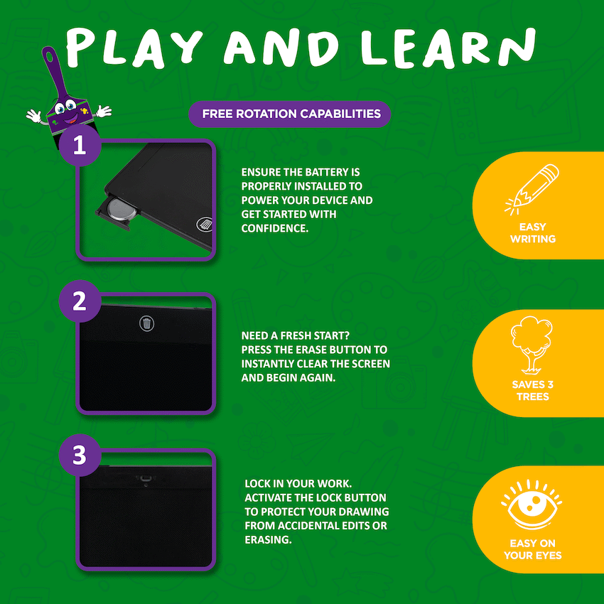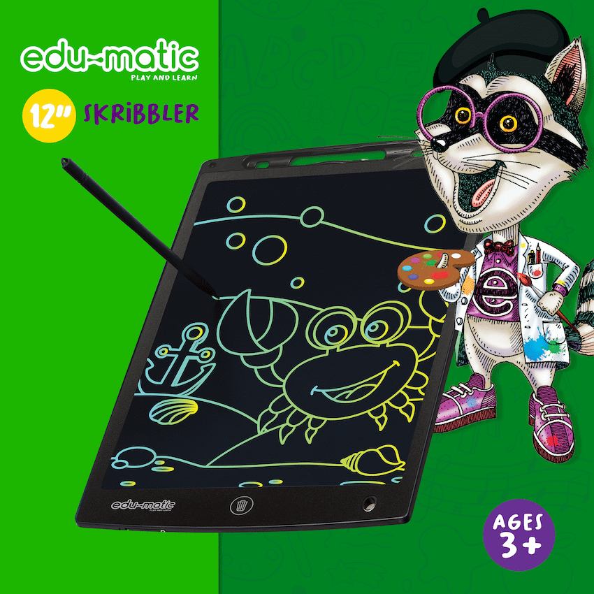 The Edu-Matic Kids Scribbler Drawing Pad – the ultimate creative companion for your child! This innovative drawing pad is designed to unleash your child’s artistic potential while also promoting eco-friendliness. Let’s dive into the fantastic features that make this pad a must-have for young artists.Pressure-Sensitive Color Writing Surface: The Edu-Matic Kids Scribbler boasts a state-of-the-art pressure-sensitive color writing surface, allowing your child to create vibrant, dynamic drawings with precision. With varying pressure, they can effortlessly switch between thin and thick lines, making their creations truly unique.Lightweight and Portable: Whether your child is at home, in the car, or on a family outing, this drawing pad is the perfect travel companion. It’s lightweight and portable, making it easy to take anywhere, ensuring endless hours of creative fun on the go.Easy Erasing with the Touch of a Button: Say goodbye to messy erasers and wasted paper! Our Scribbler Drawing Pad features a user-friendly one-touch erase button, allowing your child to clear their canvas in an instant. No more hassle, just endless creativity.12-Inch Multi-Colored Screen: The spacious 12-inch multi-colored screen provides a vast canvas for your child’s imagination to run wild. With a range of colors to choose from, every drawing will be a burst of vibrant creativity.Eco-Friendly Solution: We believe in nurturing creativity while being responsible to our planet. The Edu-Matic Kids Scribbler Drawing Pad is an eco-friendly alternative that reduces paper consumption. Your child can draw, doodle, and write to their heart’s content without wasting a single sheet of paper.Sensitive Writing Surface: Our sensitive writing surface ensures that every stroke is captured with precision, replicating the feel of real paper. Your child will experience a natural and seamless drawing experience, making their artistic journey even more enjoyable.What’s in the box1 x Edu-Matic Kids Scribbler Drawing Pad