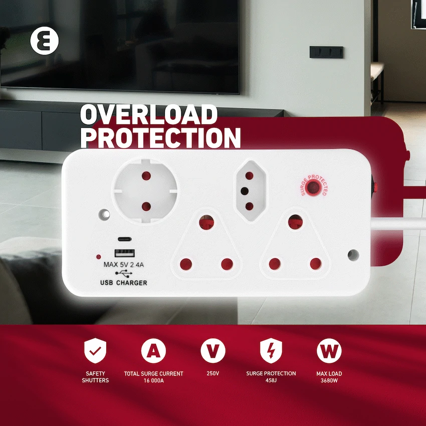 Power up safely and efficiently with the ELLIES 4-Way Surge Protection Multiplug with USB & Type C. Designed for modern South African homes and offices, this compact and convenient multiplug lets you connect multiple devices while protecting them from damaging power surges. With dedicated USB and Type C charging ports, it’s perfect for keeping your phone, tablet, and other gadgets fully charged-no extra adapters needed. Built with medium-level surge protection (458J) and an impressive 16,000A surge current capacity, it shields your valuable electronics from voltage spikes. The built-in overload protection and reset button offer an extra layer of safety, while safety shutters help prevent accidental contact, especially in homes with children. Whether you’re plugging in appliances or topping up your tech, this ELLIES multiplug makes power access simple and secure.