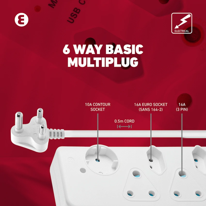 Get safe, reliable power distribution with the ELLIES 6-Way Basic Multiplug, designed for everyday use in homes and offices across South Africa. This compact and efficient 6 way multiplug gives you a mix of plug options in a small footprint, making it ideal for desks, kitchen counters, and entertainment units. Engineered with built-in safety features, this multiplug with overload protection helps prevent electrical damage with its resettable overload switch. It also includes safety shutters, giving you peace of mind-especially in family homes with young children. With its short 0.5m cable, it reduces clutter while keeping essential devices powered up and protected.