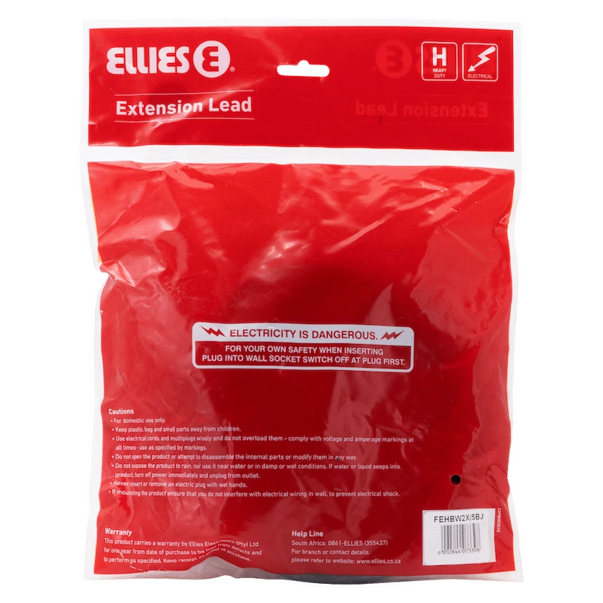 Power your space with confidence using the Ellies Back to Back Heavy Duty Extension Lead – 5m. Built for tough environments, this heavy duty extension lead delivers reliable, high-capacity power-ideal for homes, offices, or workshops where safety and performance matter.Fitted with 2 x 16A 3-pin sockets, it supports up to 16A at 250V, making it perfect for running high-demand devices or tools. The 5-metre PVC cable (3×1.5mm2) offers the flexibility to position your devices exactly where you need them without overextending power access.Designed for safer use, this Ellies extension lead includes built-in safety shutters, reducing the risk of accidental electric shock-especially useful in homes with children or in busy environments. The back-to-back socket layout provides clean, space-saving plug access without crowding.