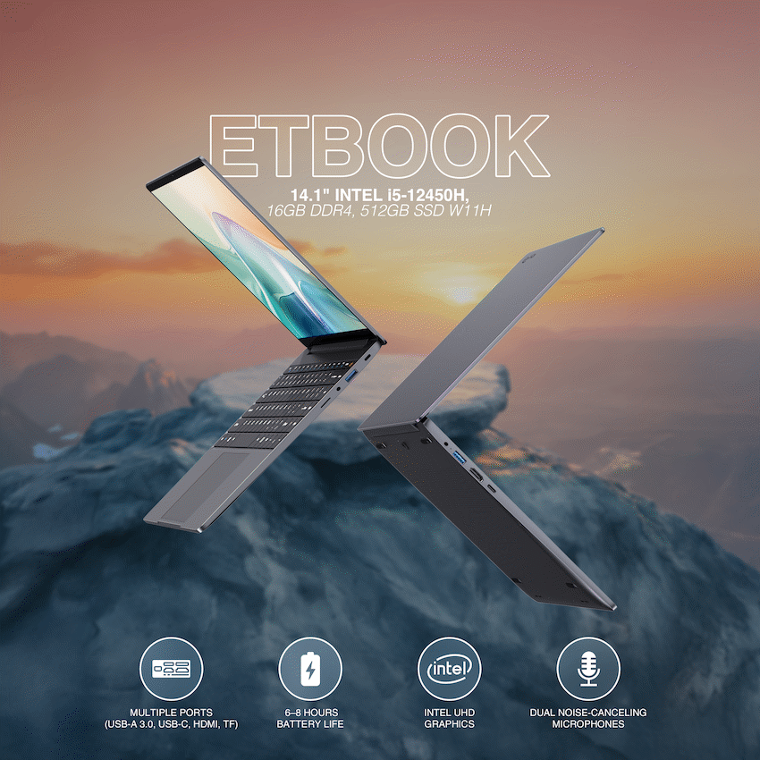 ETBook, 14.1″ Intel i5-12450H, 16gb DDR4, 512gb SSD W11HThe ETBook X laptop is powered by the Intel Core i5-12450H processor, built on a 10nm process for efficiency and speed. It features 2 high-performance cores and 8 efficiency cores, delivering a total of 12 threads for smooth multitasking. Performance cores reach up to 4.4GHz, while efficiency cores hit 3.3GHz, ensuring fast response times. Based on benchmark results, the Core i5-12450H offers excellent performance for productivity, entertainment, and everyday computing needs.