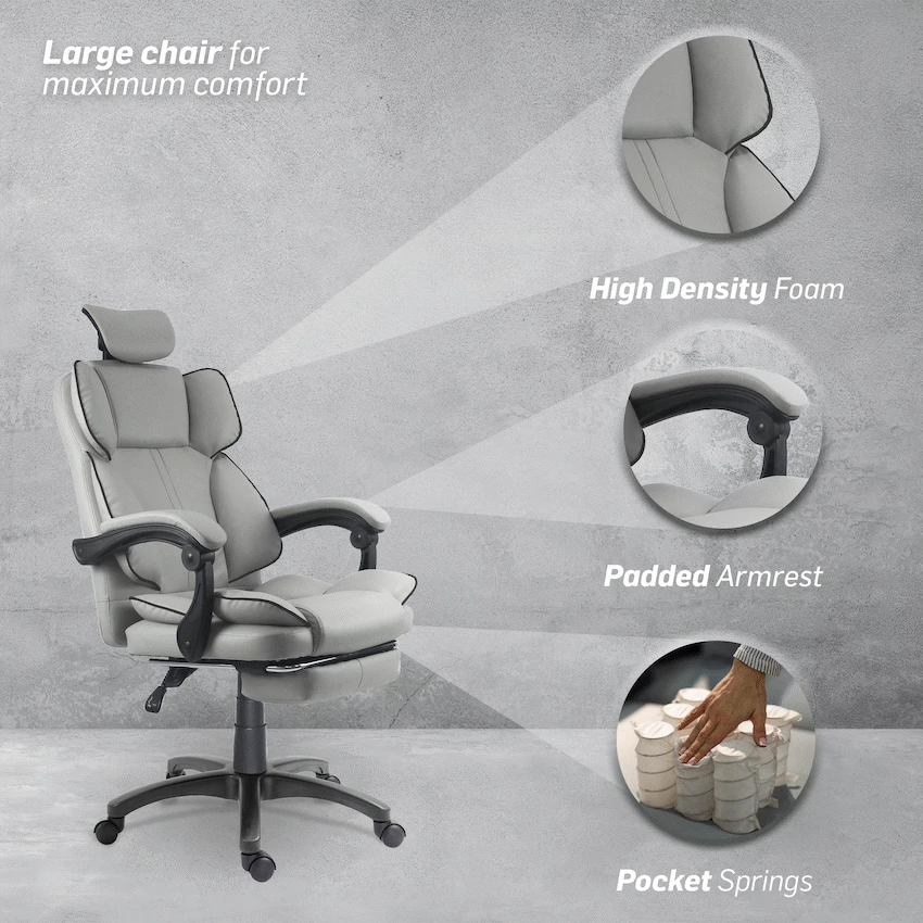 Upgrade your workspace with the Everfurn Emperor High Back Office Chair, a premium high back office chair designed for comfort, durability, and long hours of productivity. Ideal for home offices or professional environments, this chair combines ergonomic support with a sleek PU leather office chair finish that’s easy to clean and built to last.Sink into plush cushioning that supports your full upper body, while the adjustable headrest and padded armrests help reduce strain on your neck, shoulders, and arms. When it’s time to relax, the extendable footrest provides added leg support-perfect for reclined sitting or quick breaks during demanding workdays. The multi-functional mechanism allows smooth, synchronized movement between the seat and backrest, helping reduce fatigue by adapting naturally to your body’s motion.Crafted with tough faux leather and hybrid foam with spring coils, the Emperor Chair resists sagging and maintains its shape over time. A sturdy nylon and chrome base, paired with a reliable gas lift, ensures stable height adjustment and everyday durability-making it a smart ergonomic office chair for long hours.Whether you’re working, studying, or managing a busy office day, enjoy comfort that supports you from start to finish.Feature HighlightsHIGH BACK ERGONOMIC DESIGN – Full upper-body support for improved posture and reduced fatigueADJUSTABLE HEADREST – Custom neck support tailored to your heightEXTENDABLE FOOTREST – Added leg support for comfortable recliningPLUSH CUSHIONING WITH HYBRID FOAM – Spring coils reduce pressure points and resist saggingMULTI-FUNCTIONAL MECHANISM – Synchronized seat and backrest movement with lock functionPADDED ARMRESTS – Enhanced comfort for arms and shouldersEASY-CLEAN PU LEATHER – Durable, low-maintenance finish that stays looking newSTABLE CHROME & NYLON BASE – Rust- and scratch-resistant with 120kg weight capacityTechnical SpecificationsFabrication: PU Leather (1mm thickness)Foam Type: Hybrid foam with spring coilsMechanism: Multi-functionalGas Lift: Class 2Base: Nylon with chrome finish (350mm)Adjustable Height: 1210-1310mmWidth: 640mmDepth: 590mmMaximum Load: 120kgWeight: 17.3kgColour: GreyWhat’s in the Box1 x Everfurn Emperor High Back Chair – GreyInstruction Manual