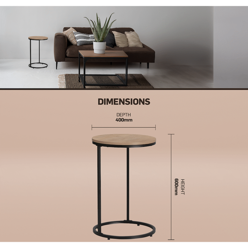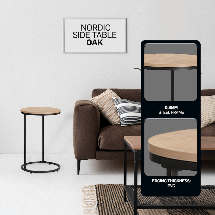 Add functional style to your living space with the Everfurn Nordic Sofa Side Table, a smart and compact solution designed for modern homes. With its slim profile and clever frame design, this sofa side table easily slides over most couch arms, keeping your essentials within comfortable reach while you relax.Inspired by clean Nordic styling, this Nordic side table features a durable engineered wood top finished with water- and scratch-resistant melamine, making it ideal for daily use in busy living rooms. The sturdy powder-coated steel frame provides reliable support and long-lasting performance, while resisting rust and surface scratches over time. Protective PVC edging adds extra durability, helping the table withstand everyday bumps and knocks.Designed with practicality in mind, the compact size makes it an excellent compact side table for apartments, lounges, or reading corners where space is limited. Adjustable, floor-protecting feet help keep the table stable on uneven surfaces, ensuring a steady surface for drinks, books, or decor items. With a strong 30kg weight capacity, this table delivers dependable performance in a sleek, minimalist form.Whether used as a living room side table, couch companion, or occasional table, the Everfurn Nordic Sofa Side Table blends modern design with everyday convenience-perfect for relaxed, clutter-free living.Feature HighlightsSpace-Saving Couch Design – Slides neatly over most couch arms for easy accessCompact Nordic Style – Clean lines suit modern and minimalist interiorsDurable Steel Frame – Powder-coated legs resist rust and scratchesStable Floor-Friendly Feet – Helps level the table and protect flooringResilient Melamine Surface – Water- and scratch-resistant for daily useProtective PVC Edging – Reduces impact damage and improves longevityStrong Load Capacity – Supports up to 30kg with confidenceTechnical SpecificationsMaterial: Engineered Wood (PB Board)Top Board Thickness: 15mmFrame: 0.8mm Powder-Coated SteelFinish: Melamine Lamination with PVC EdgingWeight Capacity: 30kgProduct Weight: 3.4kgDimensions: 400mm x 400mm x 600mmWhat’s in the Box1 x Everfurn Nordic Couch Side Table1 x Instruction ManualComplete your seating area with a compact, stylish side table that brings convenience, durability, and modern Nordic design into your living room.