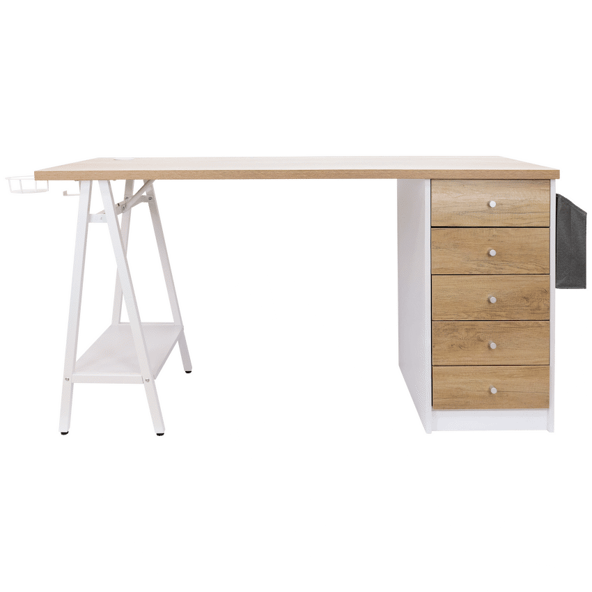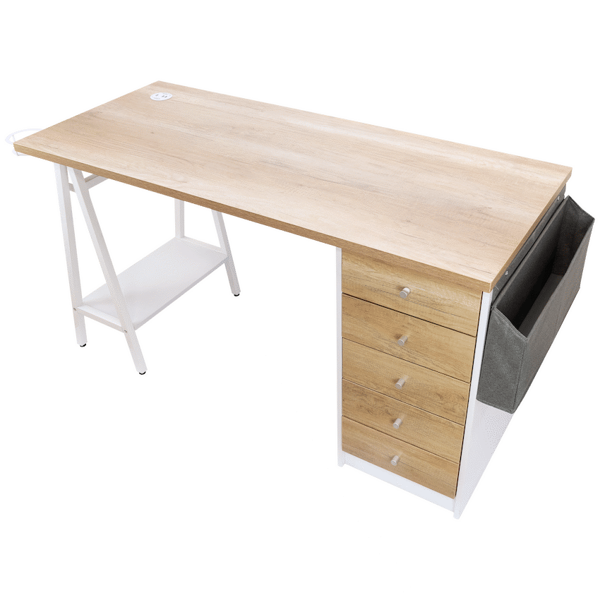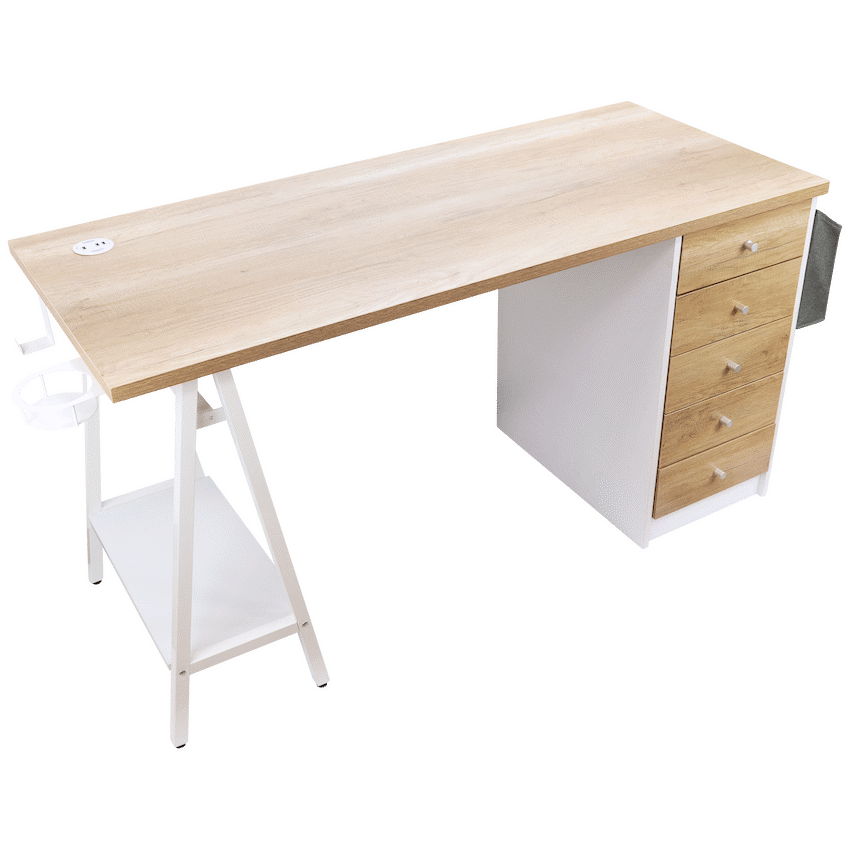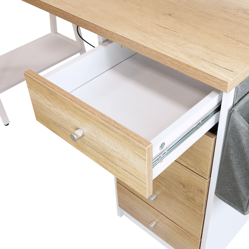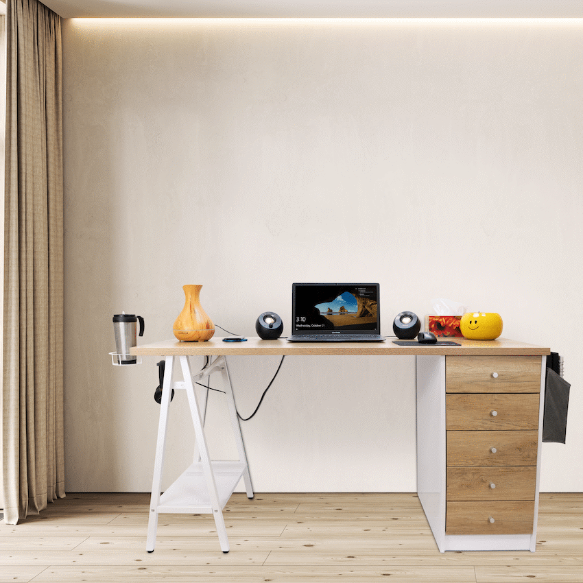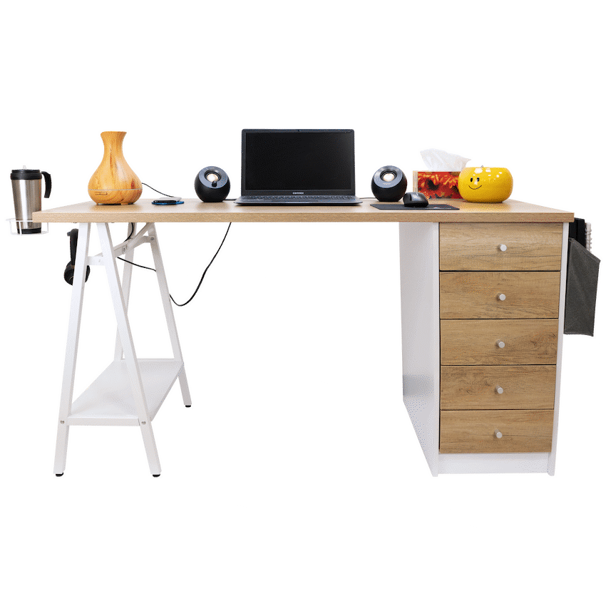 pgrade your workspace with the Everfurn Premium Milan Smart Office Desk, a smart office desk built for productivity, convenience, and style. Designed with both form and function in mind, this desk combines modern features like integrated USB ports with practical storage options, making it perfect for home offices, study rooms, and professional workspaces.Keep all your essentials within reach thanks to the built-in USB hub with two 3.1A ports, integrated cupholder, headphone hook, and a handy display shelf. Five spacious drawers and a fabric storage basket offer ample space to store office supplies, documents, and personal items, keeping your workspace tidy and efficient. Strong powder-coated steel legs and a durable melamine-laminated tabletop ensure long-lasting stability, while adjustable feet allow for leveling on uneven floors.Whether you need a premium work desk for heavy-duty use or an office desk with storage for daily tasks, the Milan Smart Desk combines practicality, style, and convenience in one sleek package.Feature HighlightsIntegrated USB Hub – 2 x 3.1A ports for easy device charging without reaching for a wall socketAmple Storage Options – 5 drawers, display shelf, and fabric basket keep your office essentials organizedBuilt-In Cupholder & Headphone Hook – Keeps necessities within reach while workingDurable Engineered Wood Surface – Melamine-laminated, water- and scratch-resistant finishStrong Steel Frame – Powder-coated legs offer rust and scratch resistanceAdjustable Levelling Feet – Ensures stability on uneven floors and protects surfacesHigh Load Capacity – 40kg overall, 10kg per shelf for heavy-duty usabilityPremium Build & Warranty – 5-year warranty ensures long-lasting performanceTechnical SpecificationsMaterial: Engineered Wood (PB Board) with Melamine LaminationTop Board Thickness: 25mm, Side Board Thickness: 15mmFrame Material: Powder-Coated Steel (0.8mm thickness)Weight Capacity: 40kg overall, 10kg per shelfProduct Weight: 41kgDimensions: 1400mm x 600mm x 760mmWhat’s in the Box1 x Everfurn Premium Milan Smart Office DeskInstruction ManualEnjoy a sleek, organized workspace with a smart office desk that combines storage, style, and technology-work smarter, stay organized, and boost your productivity every day.