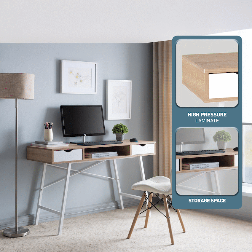 Create a comfortable and organised workspace with the Everfurn Rain Work Desk, a versatile study desk with drawers designed for everyday productivity. Whether you’re setting up a home office, study area, or compact workspace, this office desk with drawers offers a durable surface, smart storage, and a strong steel frame you can rely on.The desk features a high-pressure laminate work surface that is durable and easy to clean, making it ideal for daily use. Supported by a powder-coated metal frame, it delivers excellent strength and resistance to rust, ensuring long-lasting performance. The two integrated drawers keep stationery, documents, and essentials neatly organised and always within reach, helping you maintain a clutter-free workspace.Designed with practicality in mind, the adjustable feet allow the desk to remain stable even on uneven floors-perfect for home offices and shared living spaces. With its generous 1200mm width, this home office desk provides ample room for laptops, monitors, books, and accessories without overwhelming your space.Combining durability, functionality, and clean modern styling, the Everfurn Rain Work Desk is a dependable solution for studying, working, and staying organised every day.Feature HighlightsDurable Laminate Surface – Easy-clean, high-pressure worktop for everyday useStrong Steel Frame – Powder-coated metal construction for strength and rust resistanceTwo Storage Drawers – Keep work essentials organised and within easy reachAdjustable Feet – Maintains stability on uneven floorsSturdy Everyday Design – Reliable support for work, study, and office tasksTechnical SpecificationsProduct Type: Office / Study DeskFrame Material: Powder-Coated MetalWork Surface: High Pressure LaminateStorage: 2 DrawersAdjustable Feet: YesDimensions: 1200mm x 480mm x 760mmWeight: 23.5kgWhat’s in the Box1 x Everfurn Rain Work Desk1 x Instruction ManualSet up a workspace that supports focus, organisation, and productivity-day after day.