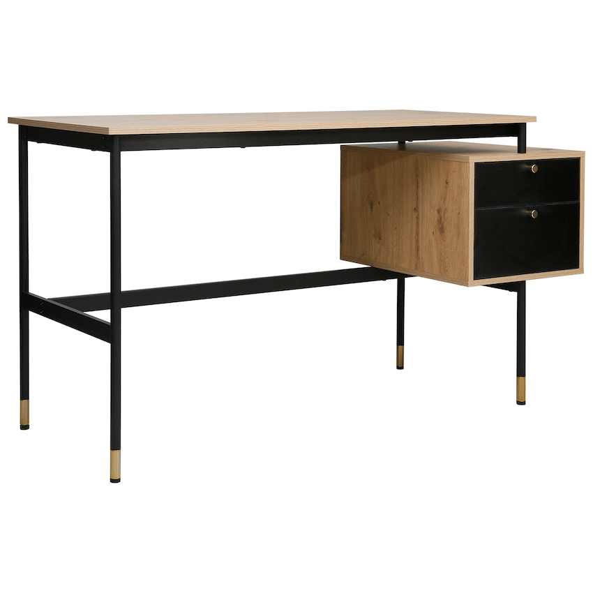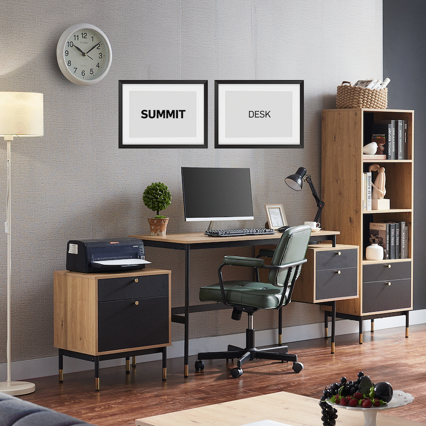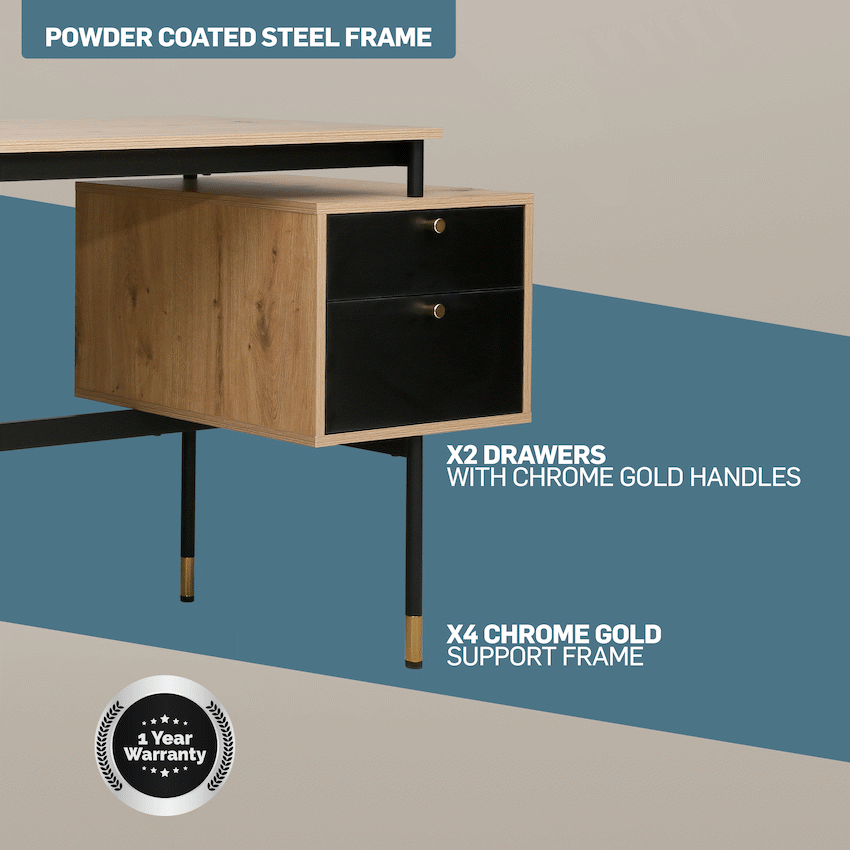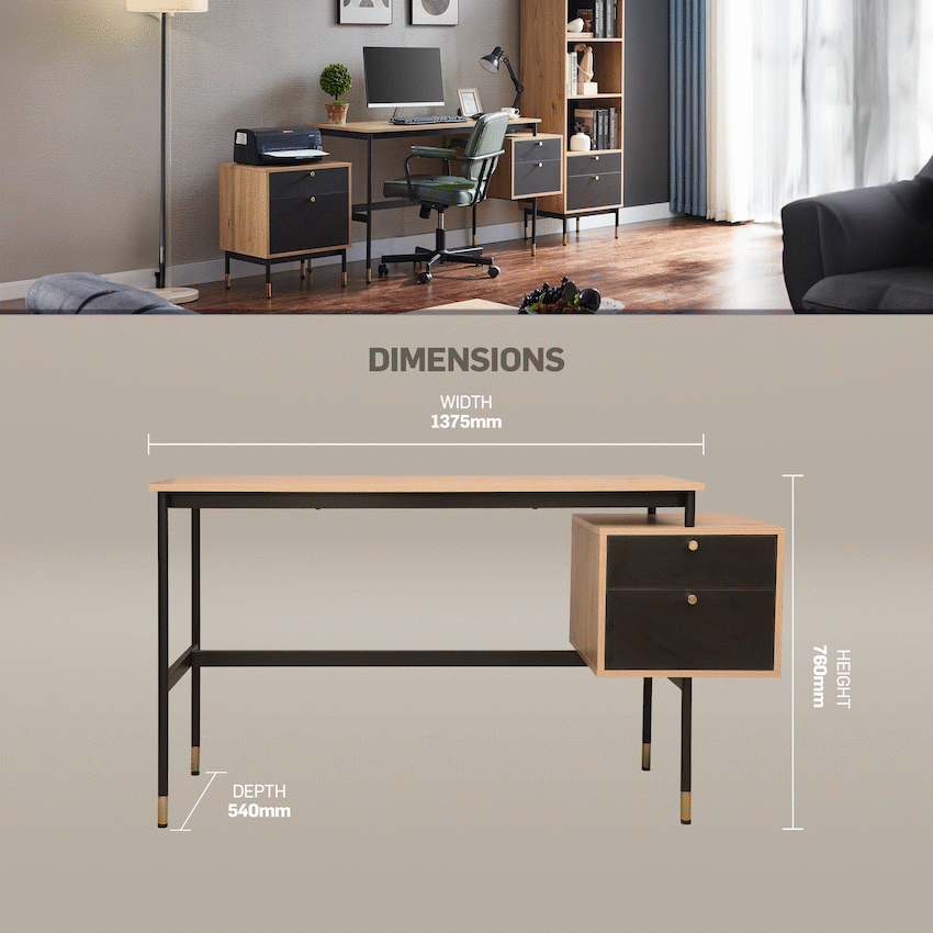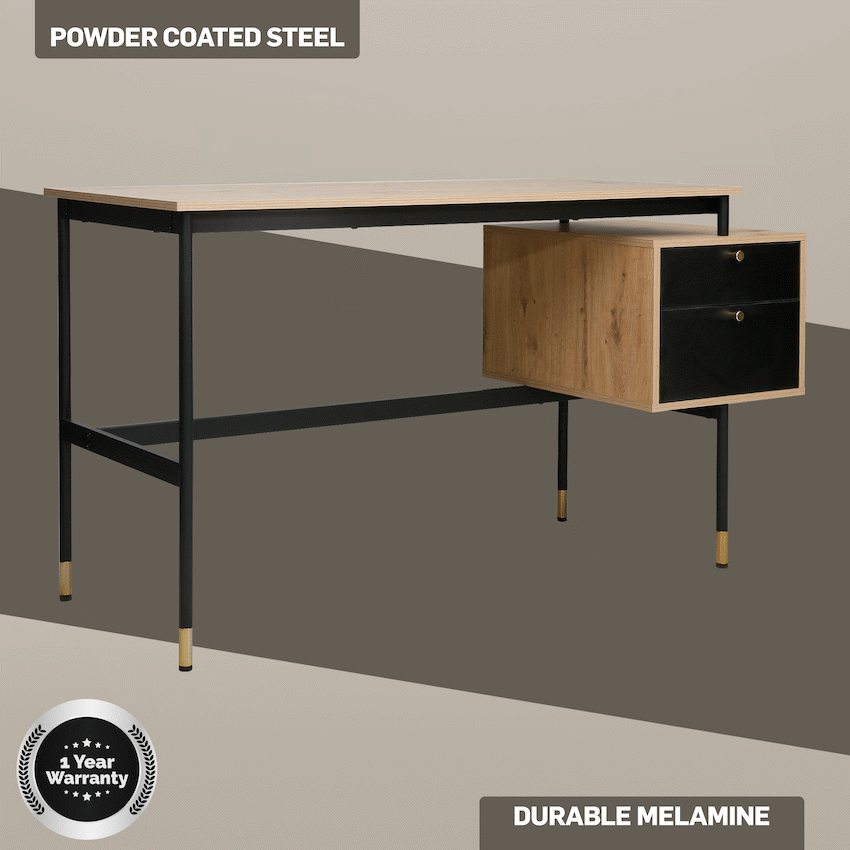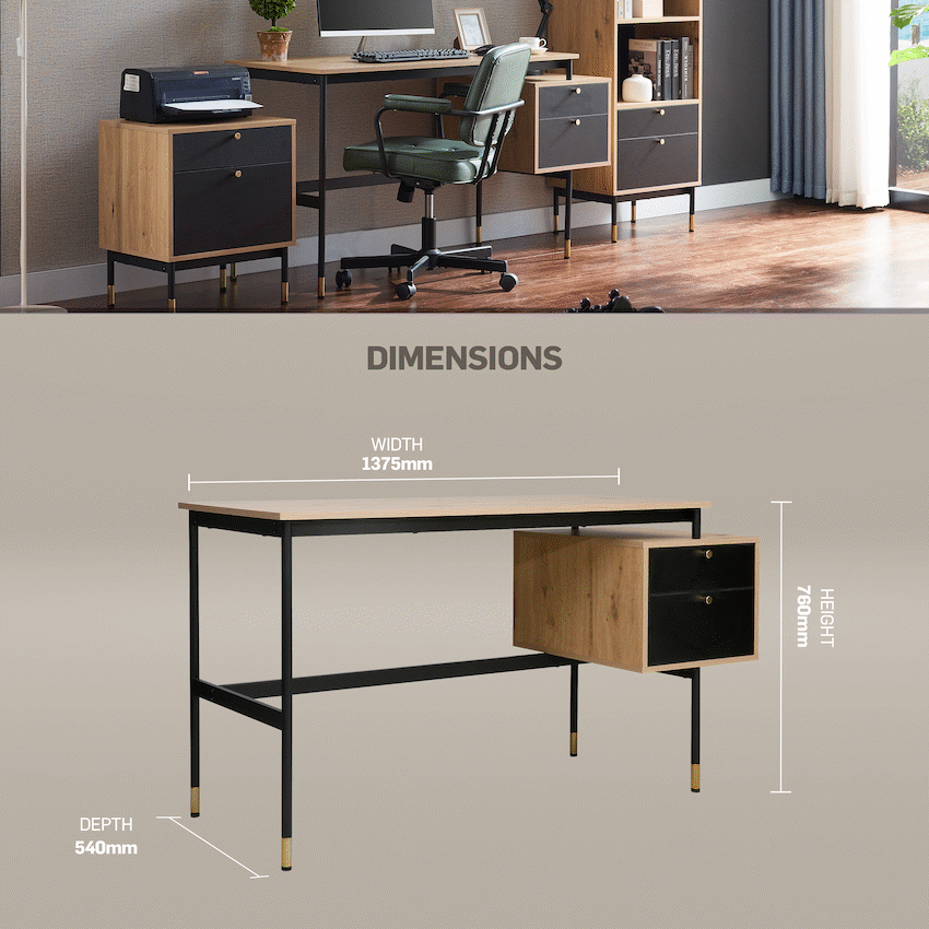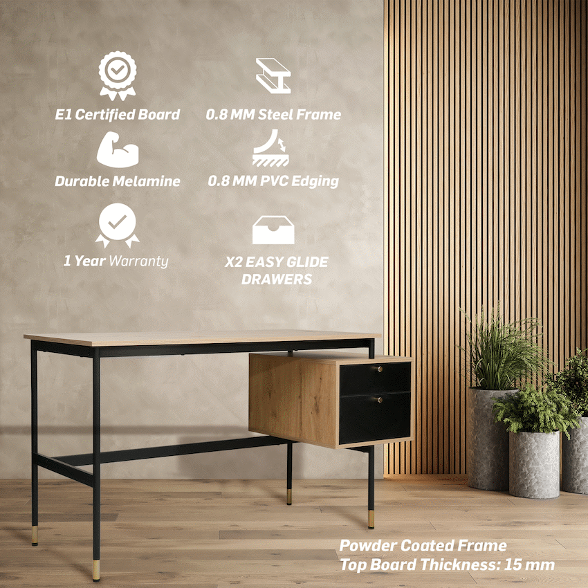 Create a refined and efficient workspace with the Everfurn Summit Office Desk with Two Drawers, designed to deliver both modern style and everyday practicality. Finished in a sleek black tone, this modern office desk is ideal for home offices, studies, or professional workspaces that value clean design and smart storage.The desk features two spacious drawers that provide organised storage for documents, stationery, and personal items, helping keep your work surface clear and focused. Its floating drawer design increases legroom beneath the desk, offering enhanced comfort during long work sessions. The generous desktop provides ample space for laptops, monitors, and daily essentials, making it a reliable computer desk with storage drawers.Built from durable engineered wood with a protective melamine finish, the surface is water- and scratch-resistant for long-lasting everyday use. The powder-coated steel frame and legs, crafted from robust 1mm steel, deliver excellent stability and resistance to rust and wear. Adjustable feet allow easy levelling on uneven floors while helping to protect floor surfaces. Finished with PVC edging, the desk is designed to withstand daily knocks and maintain its polished appearance.Feature HighlightsTwo Integrated Drawers – Keeps documents and office essentials neatly organisedFloating Drawer Design – Provides increased legroom for added comfortDurable Melamine Surface – Water- and scratch-resistant for everyday usePowder-Coated Steel Frame – Rust- and scratch-resistant for lasting stabilityAdjustable Feet – Ensures a level, stable desk on uneven surfacesPVC Edge Protection – Helps guard against impact and wearHigh Load Capacity – Supports up to 40kgTechnical SpecificationsMaterial: Engineered Wood (PB Board)Finish: Melamine Lamination with PVC EdgingFrame: Powder-Coated Steel (1mm)Board Thickness: 15mm (Top and Sides)Colour: BlackMaximum Load Capacity: 40kgDimensions: 1375mm x 540mm x 760mmWeight: 26kgWarranty: 1 YearWhat’s in the Box1 x Everfurn Summit Desk1 x Instruction ManualUpgrade your home office with a modern black desk that combines comfort, durability, and smart storage-designed to support productivity every day.