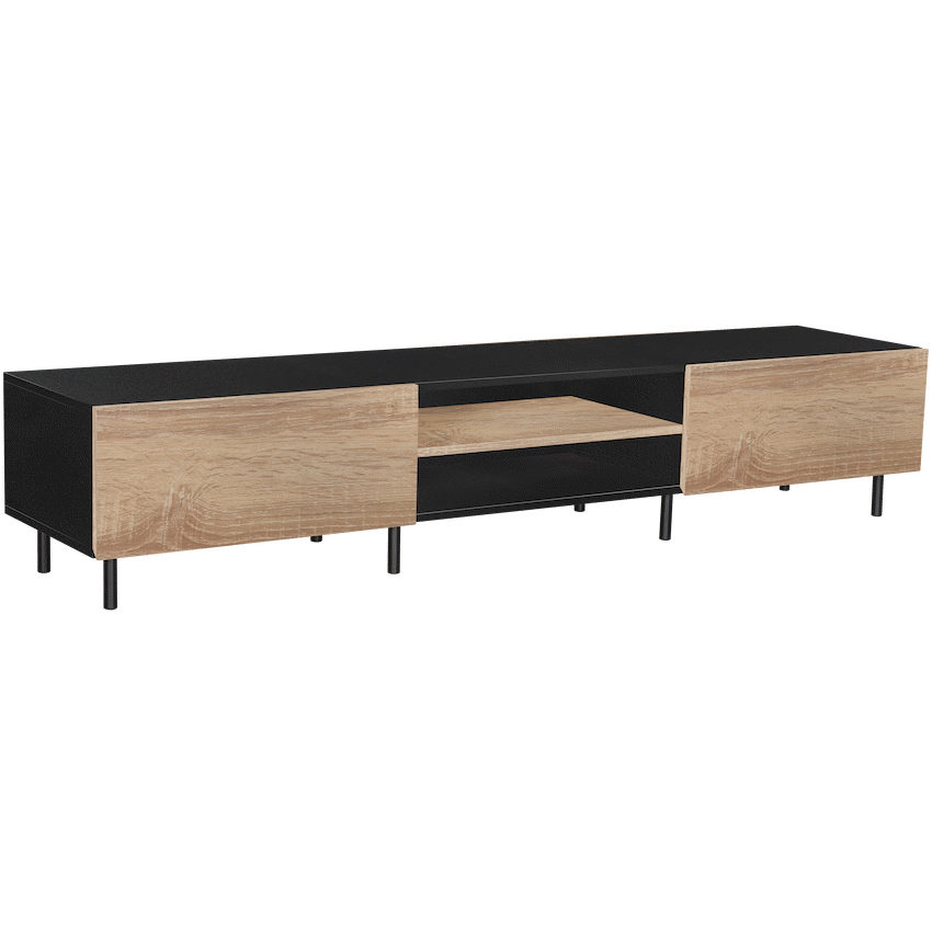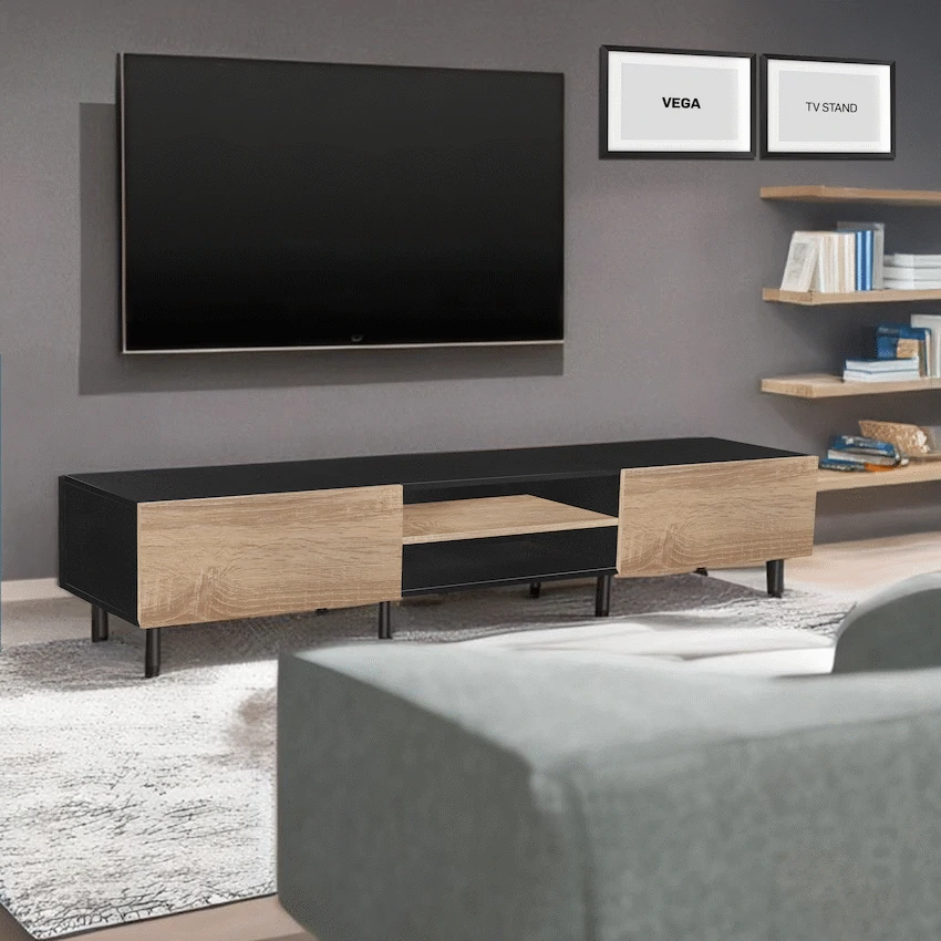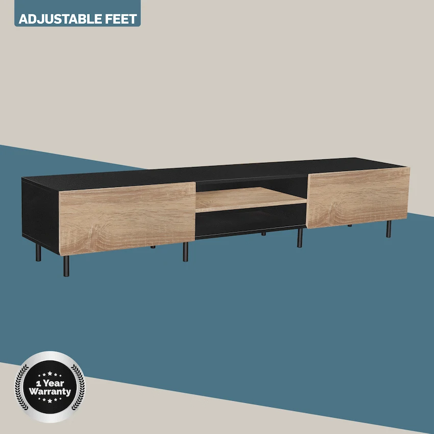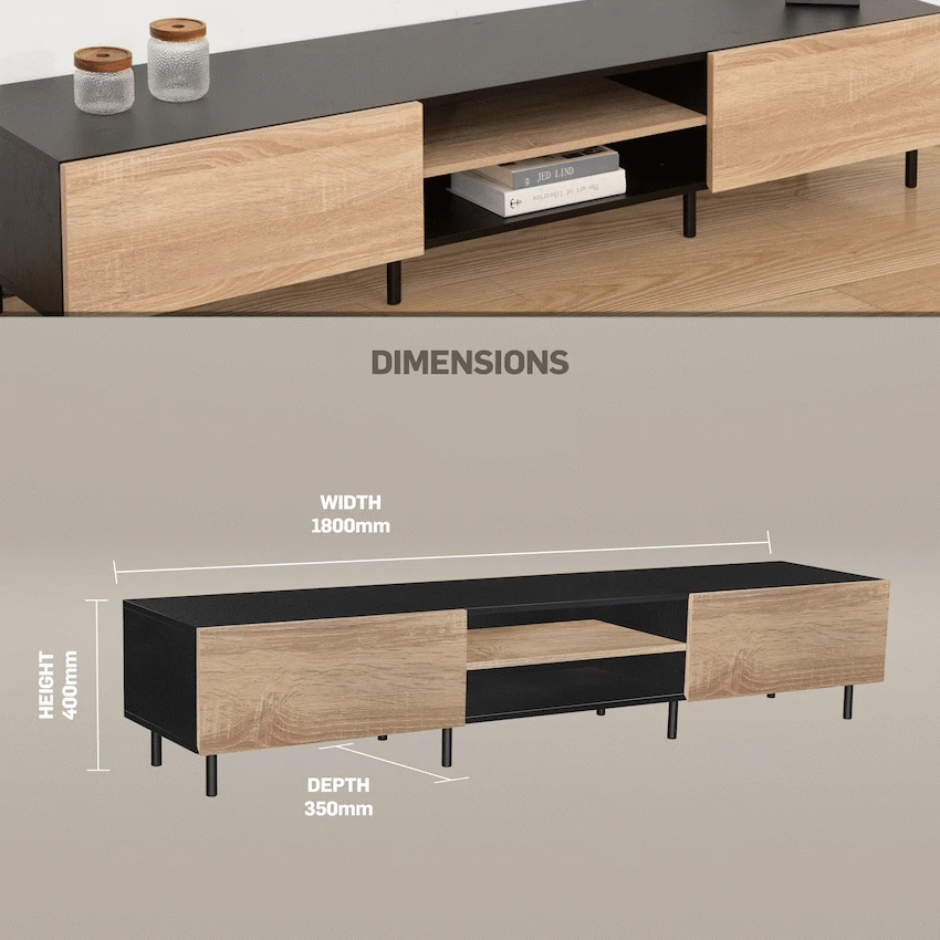 Bring effortless organisation and contemporary style to your living room with the Everfurn Vega TV Stand 1800, a modern TV stand with storage designed for everyday functionality. With its clean-lined design and generous width, this Everfurn TV stand comfortably accommodates larger TVs while keeping your entertainment space neat and clutter-free.Crafted from durable engineered wood with a scratch-resistant paper laminate finish, this wooden TV stand with metal legs is built for long-lasting use. Two spacious cupboards provide enclosed storage for media devices, remotes, and accessories, while soft-close hinges prevent slamming-helping extend the life of the unit and ensuring quiet operation.Designed with convenience in mind, this TV unit with cupboards features dual cable management ports to keep wires neatly hidden for a streamlined appearance. Powder-coated steel legs add stability and modern appeal, while floor protection feet help safeguard your flooring from scratches and marks. With an 80kg weight capacity, the Vega TV Stand offers reliable support for larger televisions.Ideal for modern homes, the Everfurn Vega TV Stand combines smart storage, durable materials, and refined style-making it a practical centrepiece for any entertainment area.Feature HighlightsModern Storage Design – Clean, contemporary look with enclosed cupboard storage1800mm Wide Surface – Suitable for larger TV sizes and wider setupsTwo Storage Cupboards – Keeps entertainment essentials neatly out of sightSoft-Close Hinges – Prevents door slamming and prolongs furniture lifespanDual Cable Management Ports – Ensures a tidy, clutter-free media areaPowder-Coated Steel Legs – Adds stability and modern contrastScratch-Resistant Finish – Durable surface designed for everyday useFloor Protection Feet – Helps prevent damage to flooring80kg Weight Capacity – Securely supports large televisions1 Year Warranty – Peace of mind with reliable coverageTechnical SpecificationsMaterial: Engineered Wood (PB Board & Masonite)Finish: Paper Lamination with PVC EdgingLegs: Powder Coated SteelTop Board Thickness: 15mmSideboard Thickness: 15mmMaximum Load Capacity: 80kgDimensionsProduct Size: 35cm (H) x 180cm (W) x 40cm (D)Weight: 33.1kgWhat’s in the Box1 x Everfurn Vega TV Stand1 x Instruction ManualCreate a refined, clutter-free entertainment space with the Everfurn Vega TV Stand-where modern design meets practical storage.