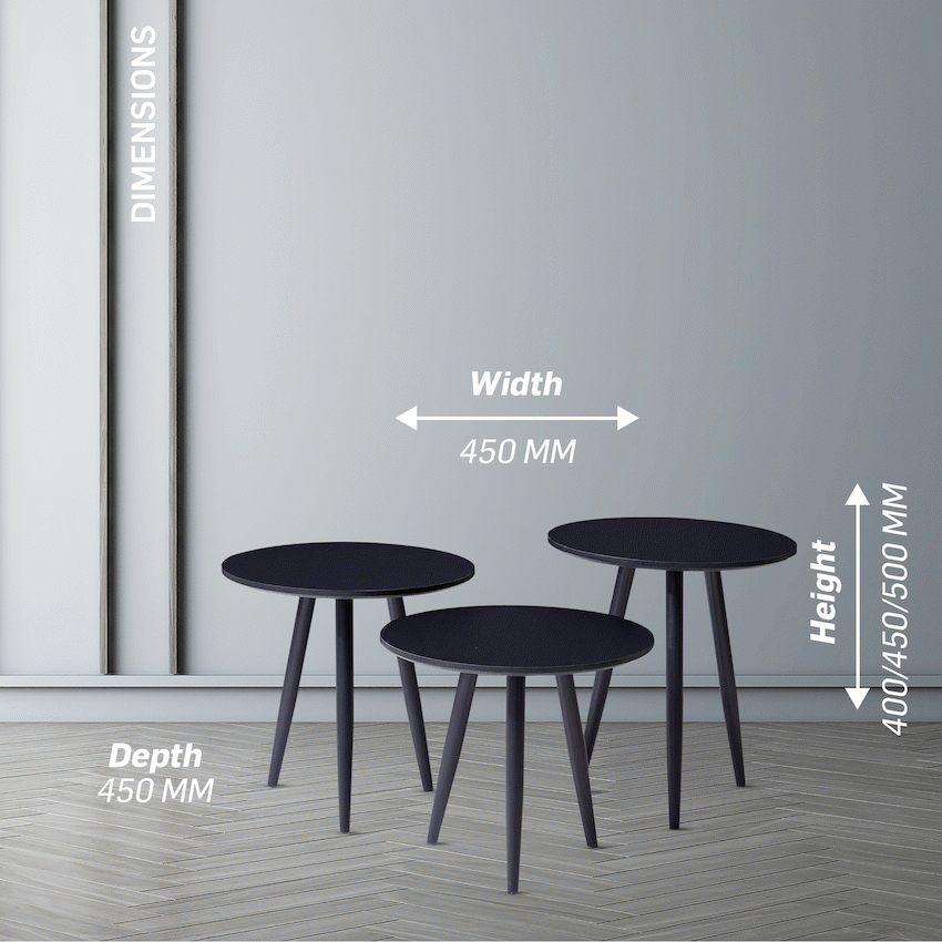 Introducing the Astro Series 3-Piece Coffee Table Set – a contemporary and versatile ensemble designed to elevate your living space. Immerse yourself in the features of this coffee table set, thoughtfully crafted to combine modern aesthetics with practical functionality.Astro Series 3-Piece Coffee Table Set: Style Meets VersatilityOptimal Dimensions: With a depth of 450mm and a width of 450mm, the Astro Series Coffee Tables strike an ideal balance between style and practicality. Their compact design ensures versatility, allowing you to arrange them in various configurations to suit your living room layout.Variable Heights: The set includes three tables with heights ranging from 400mm to 500mm, providing you with options to create dynamic and visually appealing arrangements. This variability adds a touch of creativity to your living space.Engineered Wood Construction: Crafted from high-quality engineered wood, the coffee tables offer both durability and a sleek aesthetic. Engineered wood ensures a stable and reliable foundation for your living room essentials.17mm Top Board Thickness: The top boards of the Astro Series Coffee Tables boast a substantial thickness of 17mm, providing a robust and stable surface for your decor, beverages, or reading materials. This thickness adds to the tables’ durability and longevity.0.8mm PVC Edging: The inclusion of 0.8mm PVC edging enhances the durability of the coffee tables while providing a polished finish. This edging protects against potential damage and reinforces the edges for long-lasting performance.0.8mm Steel Frame: A sturdy 0.8mm steel frame reinforces the structure of the Astro Series Coffee Tables, contributing to their overall stability and reliability. This feature ensures a durable foundation for your living room ensemble.Transform your living space with the Astro Series 3-Piece Coffee Table Set – a perfect combination of contemporary design, versatility, and durability. Redefine your coffee table arrangement with this stylish set that caters to both your aesthetic preferences and practical living needs.What’s in the box3 Piece Coffee Table: Astro SeriesAssembly instructions