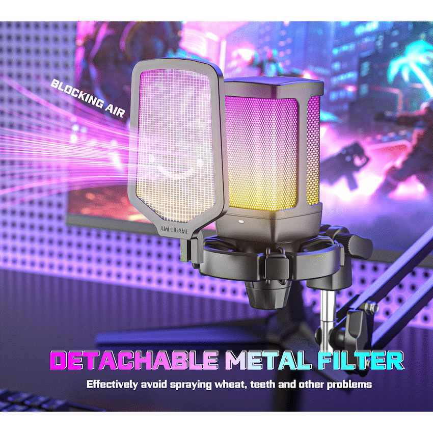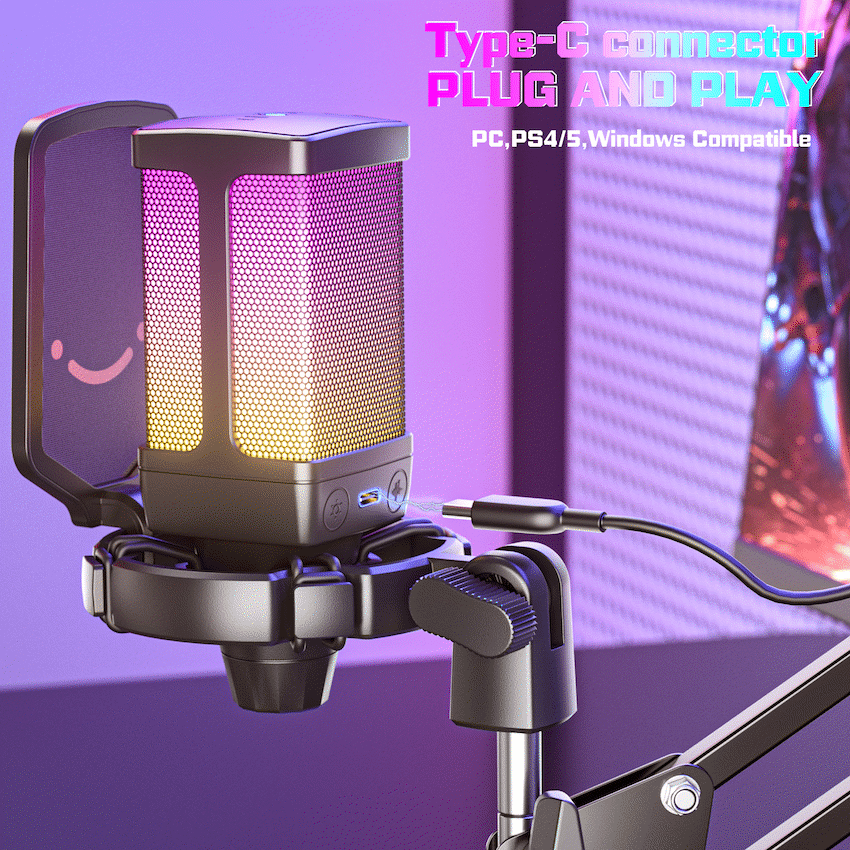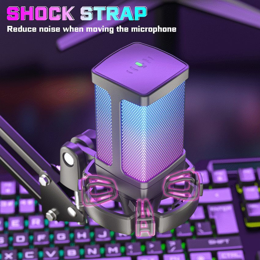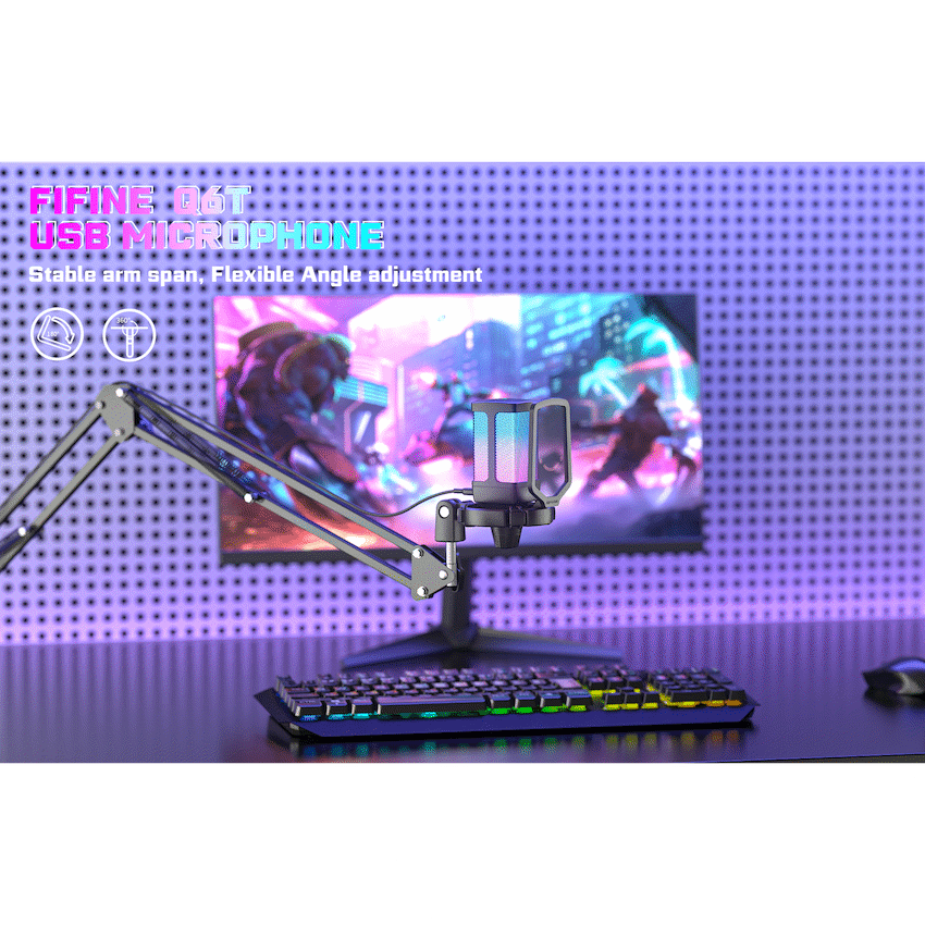 Step up your streaming, podcasting, or content creation with the Fifine Q6T RGB Microphone Kit-a go-to choice for creators who want studio-quality audio right out of the box. This feature-packed USB-C condenser mic brings your voice to life with crystal-clear sound, thanks to its high sample rate (up to 192 kHz) and cardioid pickup pattern for focused voice capture.Effortless control is built in, with a touch-to-mute button and gain adjustment knob, while noise suppression reduces background distractions. Customizable auto-changing RGB lighting sets the mood and elevates your setup’s visual appeal. A full accessory suite-including a pop filter, shock mount, and desk stand-gives you everything needed for professional-grade sound and stable positioning.Plug in via USB-C to USB-A, and you’re streaming, recording, or gaming in pristine audio clarity.