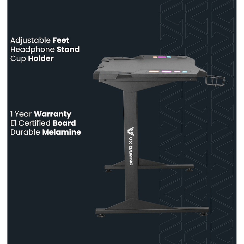 Transform your gaming setup with the VX Gaming Fortress Gaming Desk with RGB Lights, designed to deliver comfort, stability and an immersive gaming experience. Whether you’re grinding ranked matches, streaming for hours or working from home, this ergonomic gaming desk curves around you to keep everything within easy reach-so you stay focused and comfortable for longer.Built with a durable engineered wood desktop and a reinforced powder-coated steel frame, this desk offers a solid, wobble-free foundation for your gaming gear. Integrated RGB lighting enhances your setup with a modern gaming aesthetic, while practical features like the built-in cup holder and headphone hook keep your space organised and clutter-free. Adjustable feet ensure perfect balance on uneven floors, making it ideal for any room in your home.Designed for South African gamers who want both style and performance, the Fortress Gaming Desk combines durability, comfort and smart functionality in one sleek package.Feature HighlightsIntegrated RGB Lighting – Enhance your gaming atmosphere with immersive lighting effectsErgonomic Curved Design – Wrap-around shape creates a comfortable and immersive gaming spaceBuilt-In Cup Holder & Headphone Hook – Keep drinks safe and accessories within easy reachRock-Solid Steel Frame – Powder-coated, rust- and scratch-resistant legs for long-term durabilityAdjustable Feet – Achieve perfect balance and a wobble-free setup on any surfaceDurable Desktop Surface – Water- and scratch-resistant melamine lamination for everyday useImpact-Resistant PVC Edging – Protects the desk from knocks and wear over timeTechnical SpecificationsMaterial: Engineered Wood (PB Board)Top Board Thickness: 18mmFrame: Powder-Coated SteelSteel Thickness: 1.2mmSurface Finish: Melamine Lamination with PVC EdgingDesktop Weight Capacity: Up to 40kgMonitor Stand Weight Capacity: Up to 10kg eachDimensions: 1400mm x 600mm x 760mmWeight: 20.9kgWarranty: 1 YearWhat’s in the Box1 x VX Gaming Fortress Gaming DeskInstruction ManualCreate a clean, immersive and comfortable gaming environment-level up your setup and play with confidence every day.