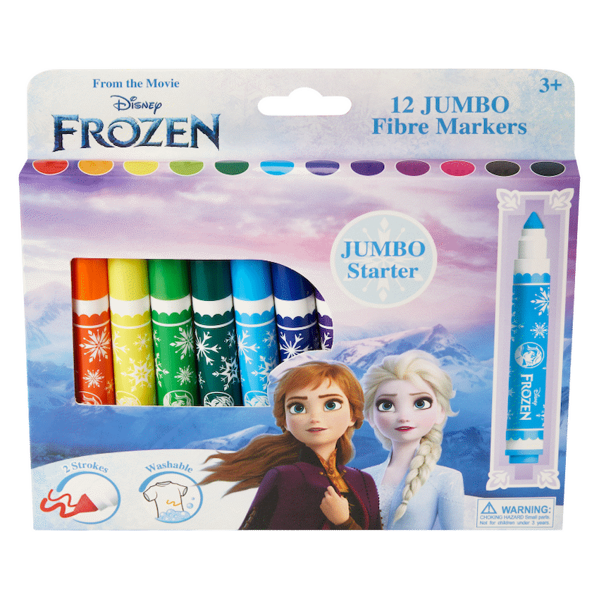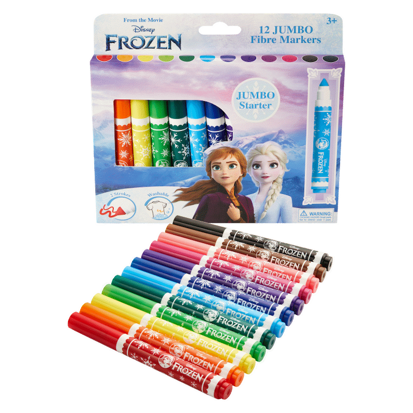 The cutest Frozen Jumbo Fibre Markers that feature dual stroke tips and a round ergonomic design for little ones to easily grip. Perfect for arts and crafts, they have a strong tip for durable drawing as they deposit bright and vibrant colours. Easy to wash and non-toxic, moms and dads will love them too!Special Features:12 Jumbo Starter MarkersDual Stroke Tip – Fine and WideWashableBright and Vivid ColoursJumbo Round Body designed for Junior ChildrenAge 3+Strong tip for Durable DrawingNon-ToxicWhat’s in the boxx12 Frozen Jumbo Fibre Markers