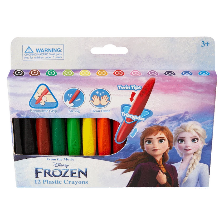 12 Plastic CrayonsTwin TipsErgonomic Triangular Grip ShapeBright & Vivid ColoursStrongEasy to CleanNon-ToxicWhat’s in the boxFrozen 12Pc Plastic Crayons Triangular