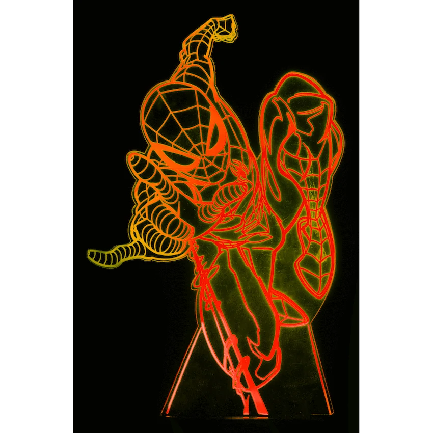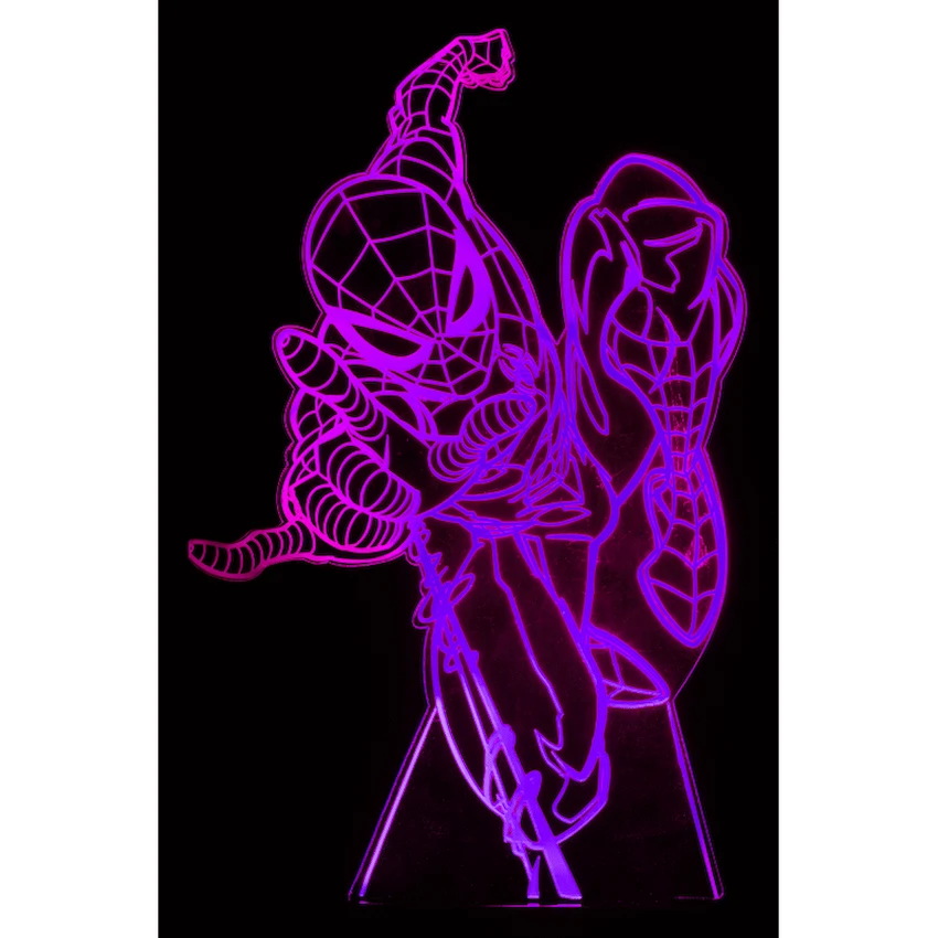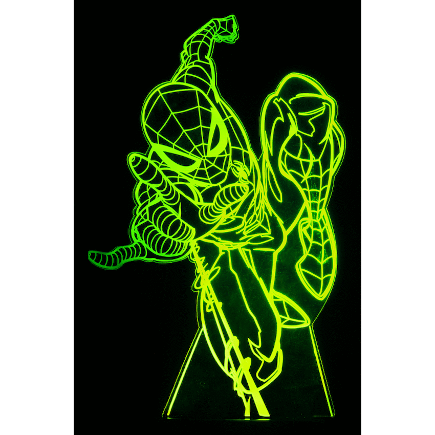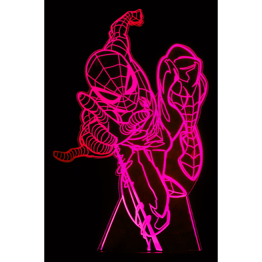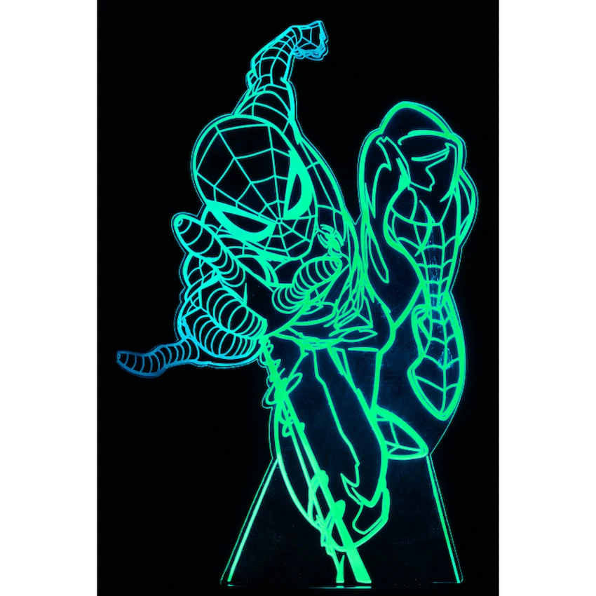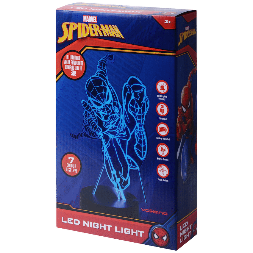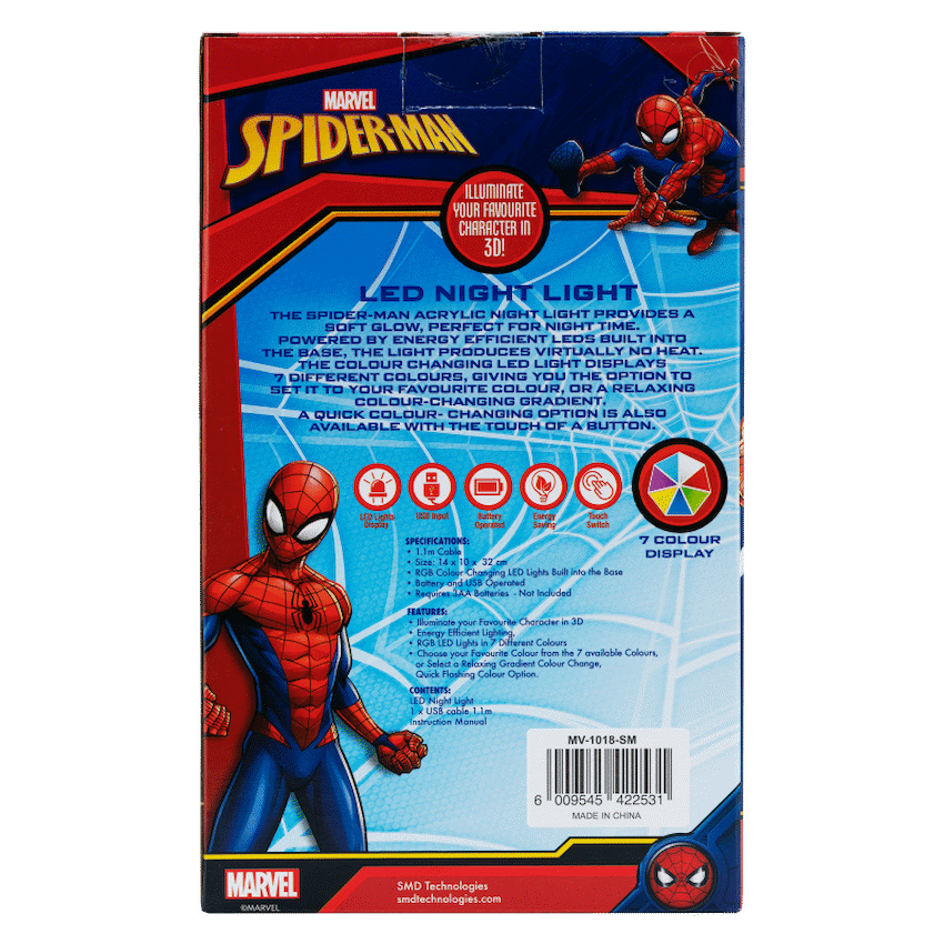 The Spider-Man acrylic night light provides a soft glow, perfect for night time. Powered by energy efficient LED’s built into the base, the light produces virtually no heat. The colour changing light displays 7 different colours, giving you the option to set it to your favourite colour, or a relaxing colour-changing gradient. A quick colour changing option is also available with the touch of a button. Specifications: Acrylic DesignRGB lights built into the basePower Source: Battery & USBUSB Cable: 1.1mSize: 14 x 10 x 32cm Features & Benefits:Illuminate your favourite character in 3DEnergy efficient lighting7 RGB LED LightsColour Changing settings:Set to one colourGradual colour-changingQuick flashing colour-changingWhat’s in the box1 x LED Night Light1 x USB Cable 1.1m1 x Instruction Manual