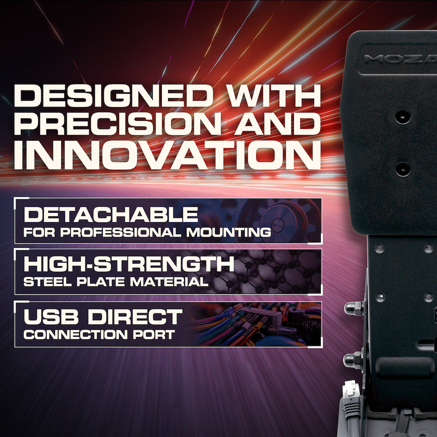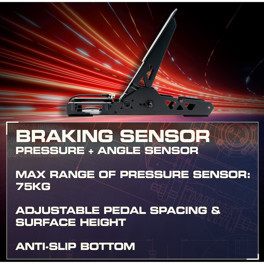 Elevate your gaming experience to new heights with the cutting-edge MOZA SR-P Pedal Gaming System. Designed with precision and innovation, this gaming pedal set is a game-changer for avid gamers seeking to take their performance to the next level.Features:- Made with high-strength steel: The pedal is machined with high-strength steel which gives it superior quality and exceptional durance.- High precision pressure sensor for up to 100 KG: The brake uses high precision pressure sensor for up to 100KG. It allows racers to control the pressure they place on the pedal through muscle memory, which is handier than travel control.- Dual sensor fusion algorithm: The brake adopts the pressure sensor and angle sensor fusion algorithm. The initial stage is dominated by the angle sensor which allows racers to control the braking angle, the mid and last stage is dominated by pressure sensor, which makes the pedal easier to control.- Braking spring and damping block combined: The braking spring and damping block gives more control to the initial stage pedal travel and more stiffness to the last stage pedal travel, which highly simulates the foot feel in real racing.- Multiple use scenarios: The anti-slip mat at the bottom prevents the pedal from slipping while being used without professional brackets. It could also be mounted to professional brackets easily in various forms.- Adjustable pedal spacing: The pedal spacing could be adjusted according to individual needs.- Direct connection with PC through USB port : It could be connected to PC directly through USB port and connect to MOZA Pit House. It is also compatible with other sim-racing gears.- Detachable pedal design: The detachable design enables mounting the pedals on the professional brackets separately, in addition, it could meet the demand of some hardcore users to reverse the pedal. Specifications :- Material: High-strength steel- Plate Material: High-strength steel- Braking Sensor: Pressure sensor+angle sensor- Max Range of Pressure Sensor: 75KG- Throttle Sensor: Angle sensor- Angle Sensor Resolution: 16-bit (65536ppr)- Pedal Spacing: Adjustable- Pedal Surface Height: Adjustable- Pedal Connection Port: USB direct- Pedal Travel Software Adjustment: Yes- Pedal Travel Reverse Function: Yes- Anti-Slipping Bottom: YesWhat’s in the box1 x MOZA SR-P Pedal1 x User Manual