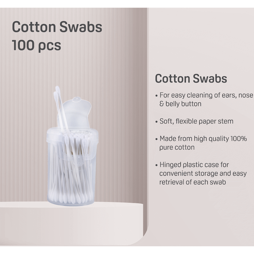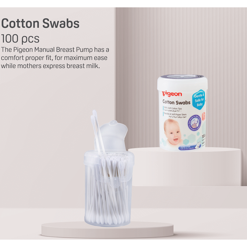 Pigeon Cotton Swabs are designed for gentle cleaning of small areas such as ears, nose, or belly button. Made from 100% pure cotton with soft, biodegradable paper stems, they are safe for delicate baby skin and environmentally friendly. The swabs come in a resealable plastic case for hygienic and convenient storage, making them ideal for everyday use at home or while traveling.