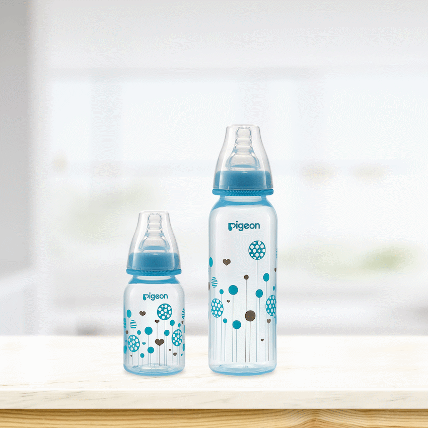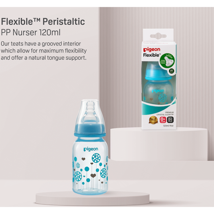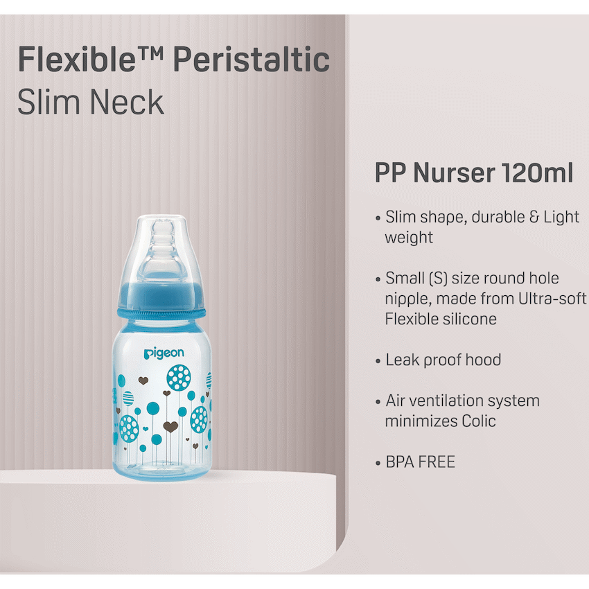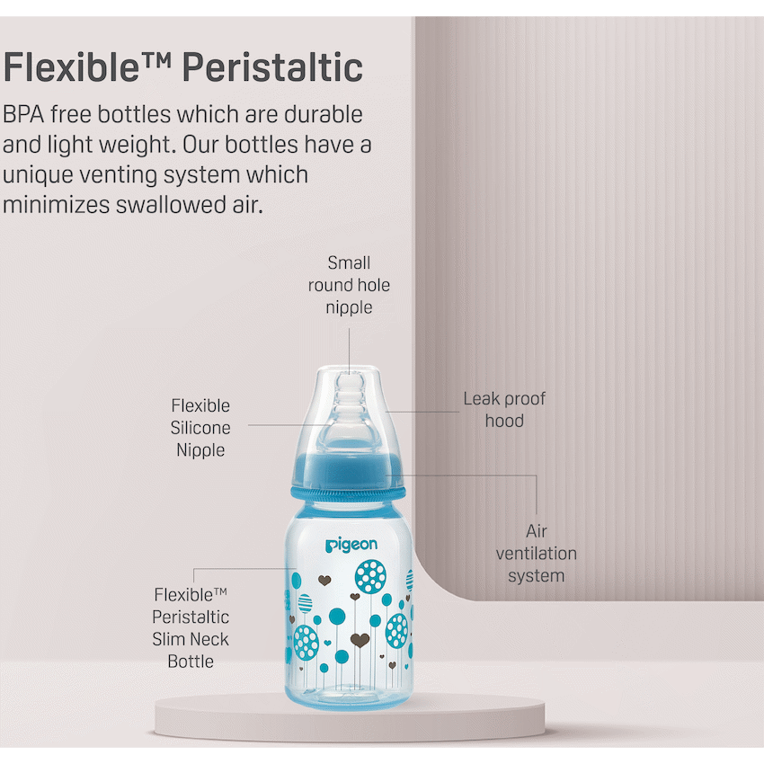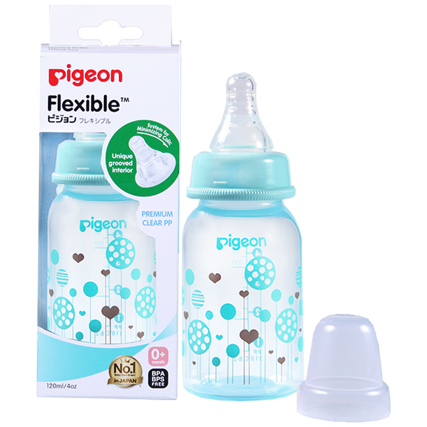 The Pigeon FlexibleTM PP Bottle is a slim neck bottle with a cute blue balloon design. Use with FlexibleTM Peristaltic Teats is made from light weight plastic. Best suited for low to regular use. When baby is not breast-fed. Baby is very small and if baby sometimes fusses at the teat. Comes with a Flexible Small (S) hole Nipple which has a slim neck and is made with double thick silicone that is soft and makes latching easy. Along with a venting system that helps minimize swallowed air and colic in babies. This bottle is BPA free.