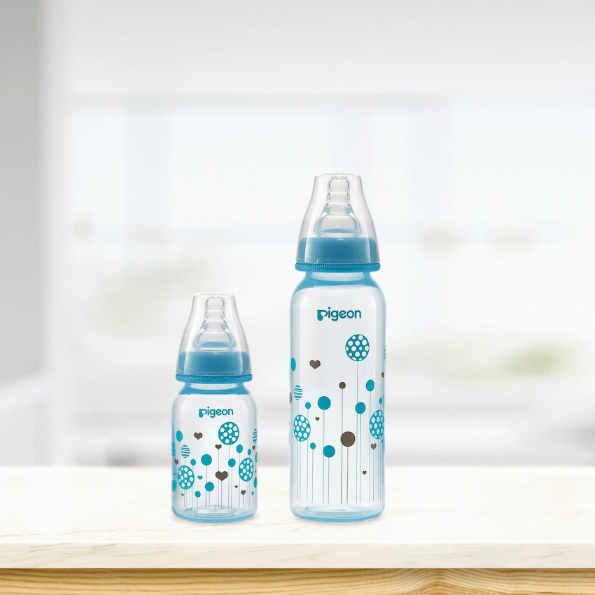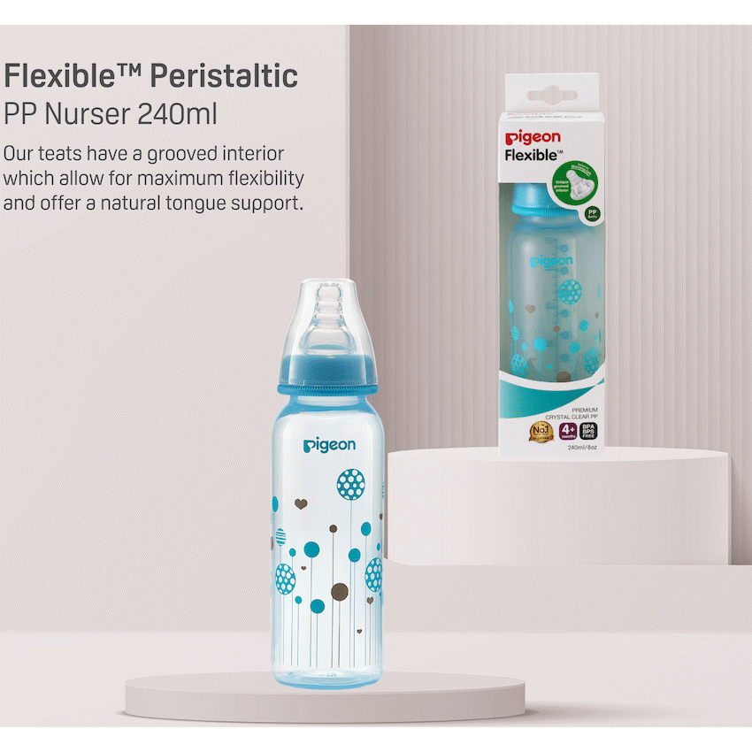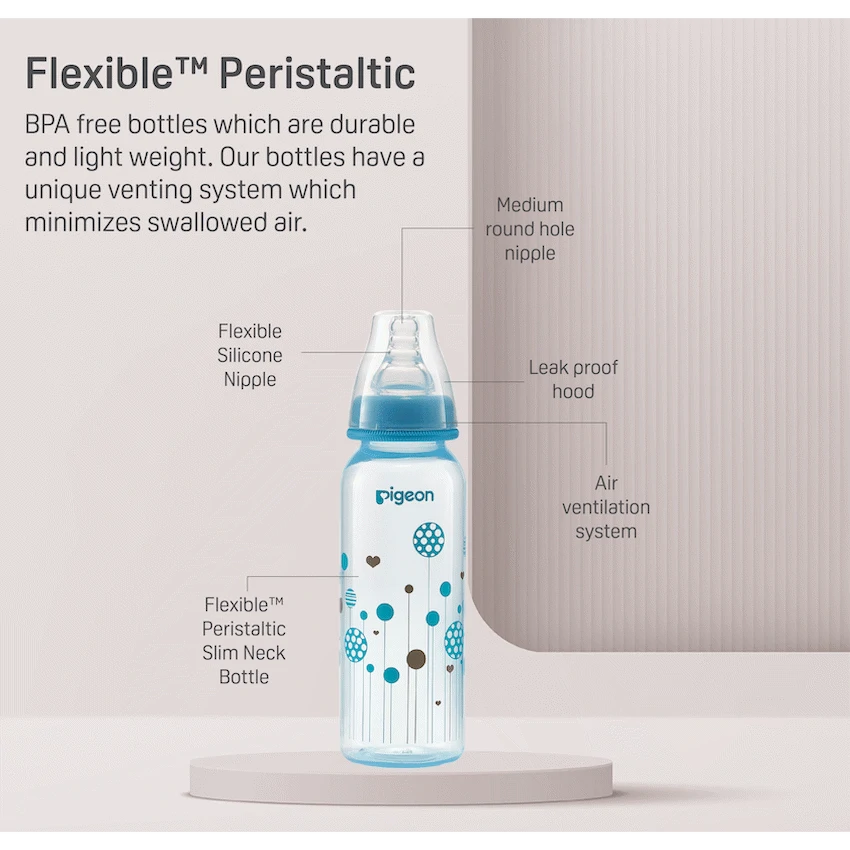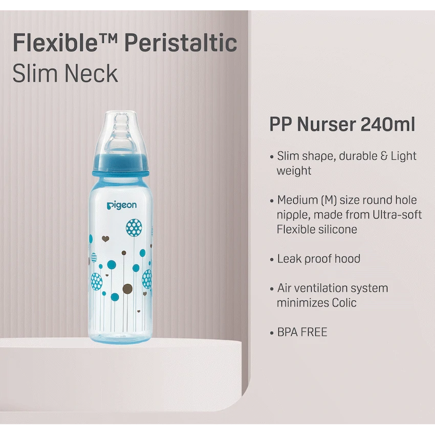 The Pigeon FlexibleTM PP Bottle is a slim neck bottle with a cute blue balloon design. Use with FlexibleTM Peristaltic Teats is made from light weight plastic. Best suited for low to regular use. When baby is not breast-fed. Baby is very small and if baby sometimes fusses at the teat. Comes with a Flexible Small (S) hole Nipple which has a slim neck and is made with double thick silicone that is soft and makes latching easy. Along with a venting system that helps minimize swallowed air and colic in babies. This bottle is BPA free