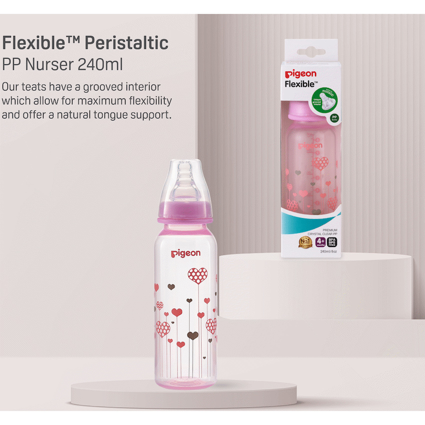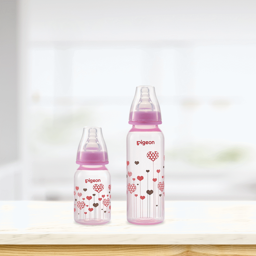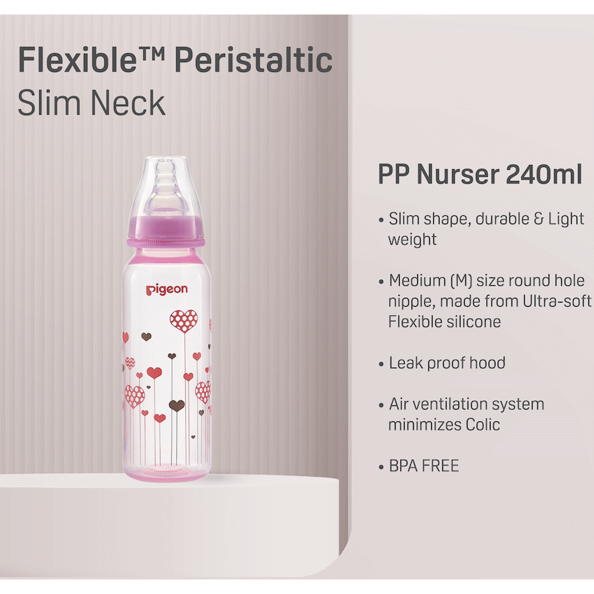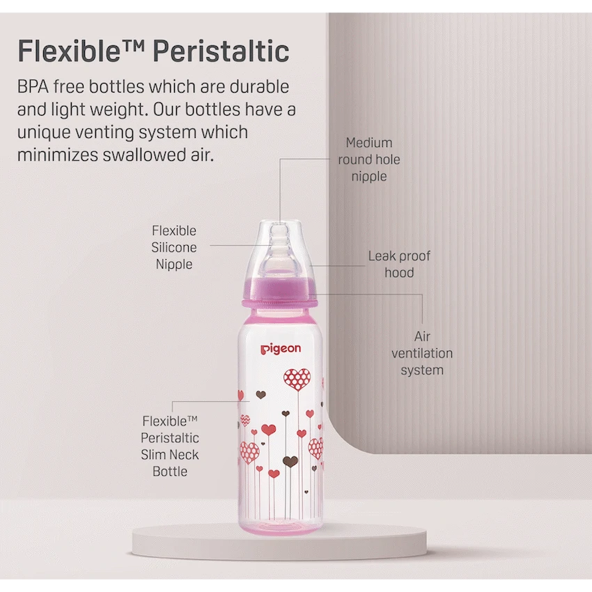 The Pigeon FlexibleTM PP Bottle is a slim neck bottle with a cute pink heart design. Use with FlexibleTM Peristaltic Teats is made from light weight plastic. Best suited for low to regular use. When baby is not breast-fed. Baby is very small and if baby sometimes fusses at the teat. Comes with a Flexible Medium (M) hole Nipple which has a slim neck and is made with double thick silicone that is soft and makes latching easy. Along with a venting system that helps minimize swallowed air and colic in babies. This bottle is BPA free.