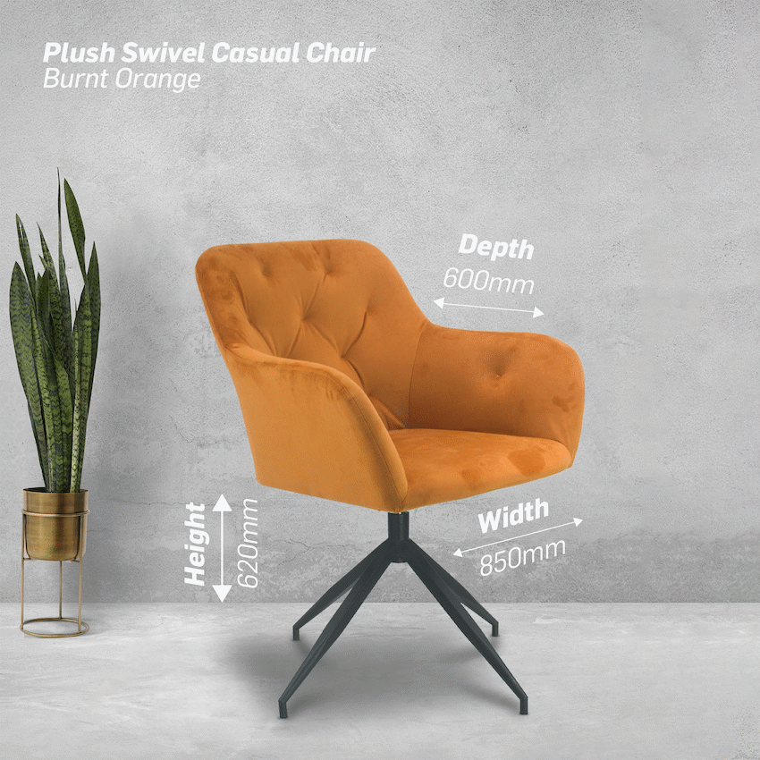 Add a touch of style and comfort to your living space with the Everfurn Plush Swivel Casual Chair. This swivel lounge chair is designed for modern interiors, combining a luxurious velvet fabric finish with a practical 360-degree swivel feature for maximum versatility.The chair’s steel base ensures stability and durability, while the virgin foam cushioning provides plush comfort for hours of relaxed seating. With a 120 kg weight capacity, it is suitable for a wide range of users, making it perfect for your living room, reading nook, or home office.The vibrant burnt orange velvet upholstery adds a stylish accent to any space, while the chair’s modern design complements contemporary decor seamlessly. Its casual lounge style allows it to blend effortlessly with both minimalist and eclectic interiors, creating a cozy yet elegant seating solution.Backed by a 1-year warranty, this chair promises both style and long-lasting comfort. Whether you’re entertaining guests, working from home, or simply relaxing, the Everfurn Plush Swivel Chair is designed to elevate your space with elegance and functionality.Feature Highlights360deg SWIVEL DESIGN – Effortless rotation for versatile and flexible seating.LUXURIOUS VELVET FABRIC – Soft, stylish upholstery that enhances any interior.PLUSH VIRGIN FOAM – Provides comfort and support for long periods of use.STURDY STEEL BASE – Durable foundation ensures stability and longevity.HIGH WEIGHT CAPACITY – Supports up to 120 kg for versatile use.1-YEAR WARRANTY – Confidence in quality and durability.Technical SpecificationsMaterial: Velvet Fabric, Steel BaseCushioning: Virgin FoamSwivel: 360degWeight Capacity: 120 kgDimensions: W850 x D600 x H620 mmWeight: 13 kgWhat’s in the Box1 x Everfurn Plush Swivel Casual ChairInstruction Manual (if included)