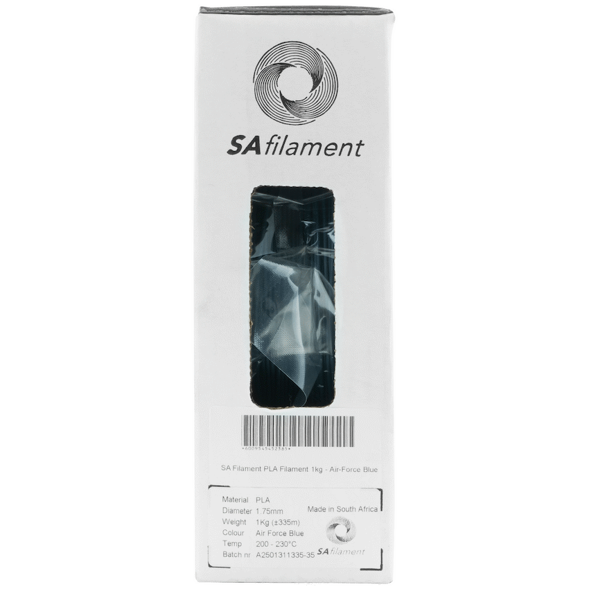 SA Filament PLA Filament 1kg – Air-Force Blue 1.75mm. Bring your 3D creations to life with the EcoPrint 1.75mm PLA 3D Printer Filament, designed for makers who want both quality and sustainability. This eco-friendly filament is made from biodegradable materials, offering smooth extrusion and consistent layer adhesion for professional-looking prints every time. Whether you’re a hobbyist, student, or professional designer, this filament ensures a hassle-free printing experience across a wide range of 3D printers.With easy handling and minimal warping, it’s ideal for detailed models, prototypes, and creative projects. Plus, its eco-conscious composition allows you to print confidently, knowing you’re choosing a greener alternative without compromising performance.