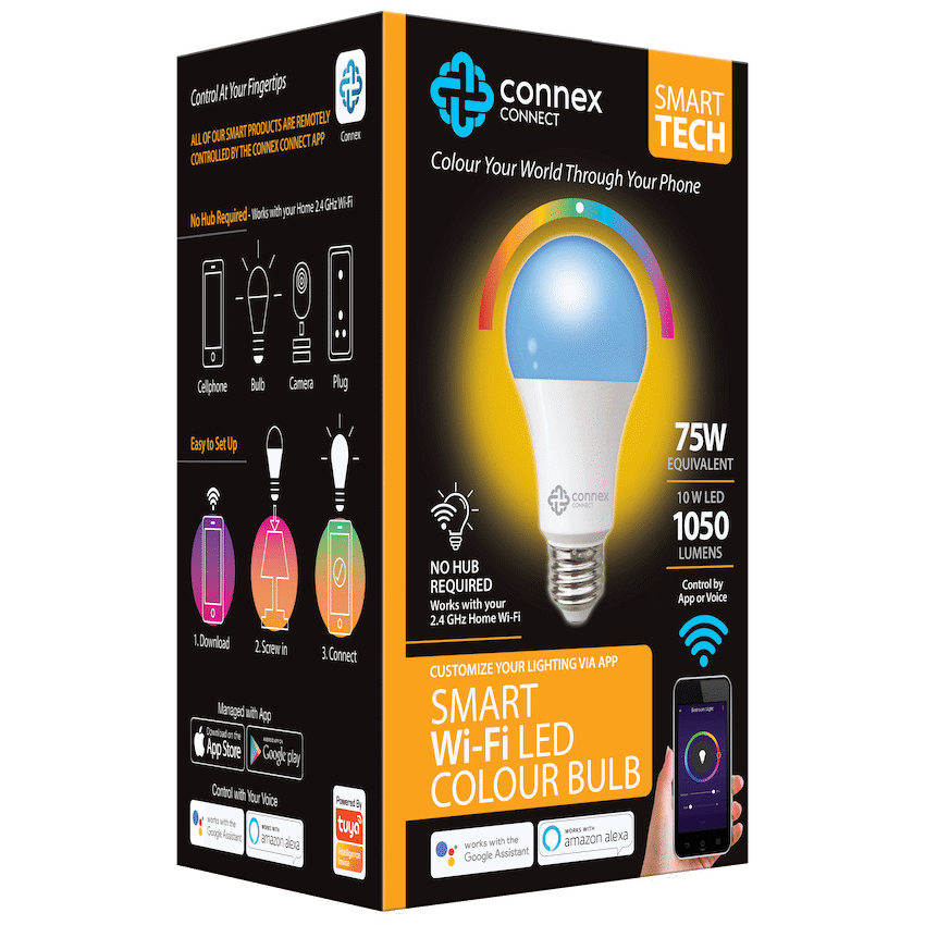 Efficient LED Smart lighting, saving 90% energy, sharply decrease your electricity costs. RGB Colours: Select 16 Million Colour Options. Bulb Type: Screw E27 Sharing: Share bulb access with family or colleagues, allowing multiple people to manage the smart lighting.Colour Options Colour LED lighting 16 Million Colour Options.Voice Control Go hands-free with Amazon Alexa and Google Assistant. Turn on/off lights via voice command. Especially convenient when your hands are full.Features:Sharing Lighting Share control of lights with trusted family members or share individual lights with work colleagues.Security Trigger Smart Tech lighting devices when your Motion, Door, Camera sensors detect movement or noise. Turn on lights, flashing red to scare away intruders.Grouping Group multiple Smart Tech lights to operate together or to manage via Voice assistant.Easy Installation Getting one or multiple lights set up around your house is easy. All you need is a Wi-Fi connection and a Smart Tech LED light bulb. Pair the Smart Light to your home network and access it immediately from the Connex Connect app.What’s in the box1 x LED Bulb