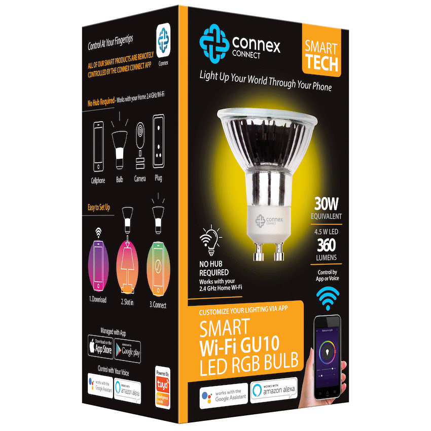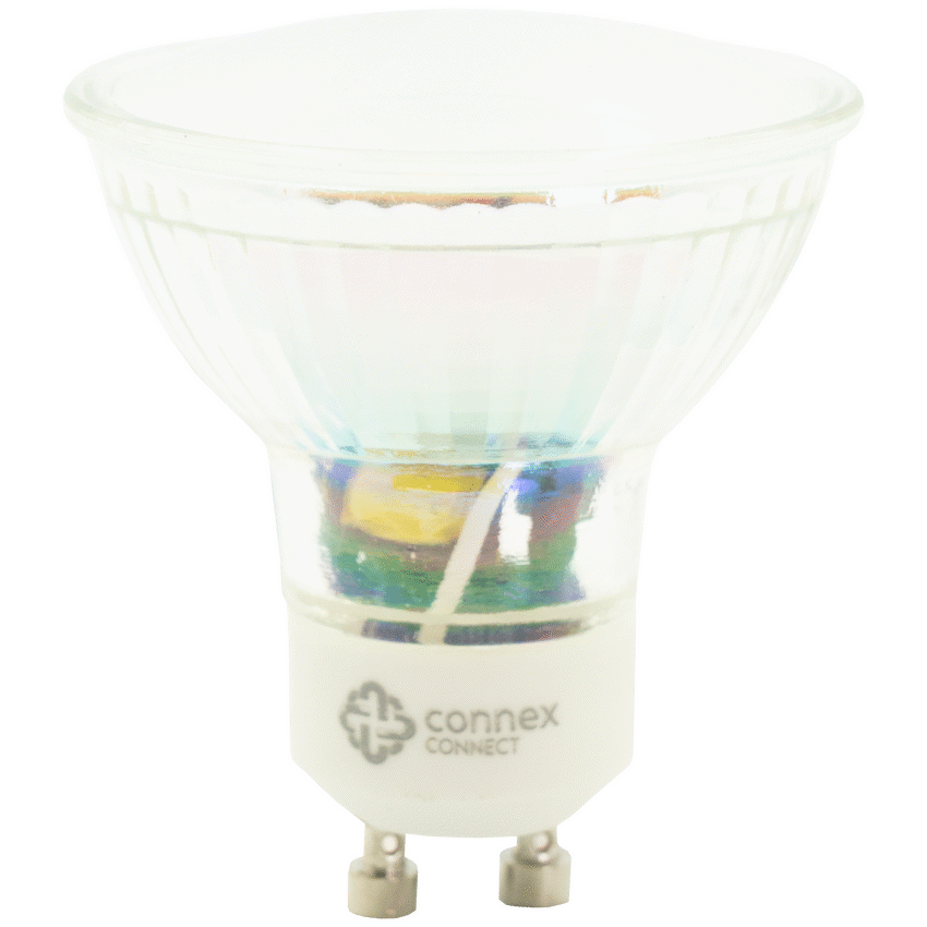 Efficient LED Smart lighting, saving 90% energy, sharply decrease your electricity costs. RGB Colours: Select 16 Million Colour Options. Bulb Type: GU10 Sharing: Share bulb access with family or colleagues, allowing multiple people to manage the smart lighting.Colour Options Colour LED lighting 16 Million Colour Options.Voice Control Go hands-free with Amazon Alexa and Google Assistant. Turn on/off lights via voice command. Especially convenient when your hands are full.Features:Sharing Lighting Share control of lights with trusted family members or share individual lights with work colleagues.Security Trigger Smart Tech lighting devices when your Motion, Door, Camera sensors detect movement or noise. Turn on lights, flashing red to scare away intruders.Grouping Group multiple Smart Tech lights to operate together or to manage via Voice assistant.Easy Installation Getting one or multiple lights set up around your house is easy. All you need is a Wi-Fi connection and a Smart Tech LED light bulb. Pair the Smart Light to your home network and access it immediately from the Connex Connect app.What’s in the box1 x LED Bulb