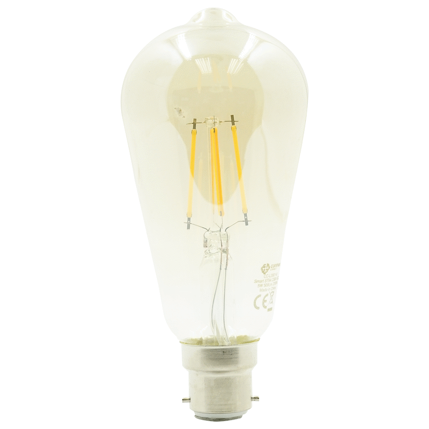 Make your Home a Smart Home with an aesthetically appealing, soft, vintage twist! Works with Amazon, Alexa and Google Assistant, the Connex Connect Smart 5W LED Amber Filament Bayonet Bulb is here to simplify your life and allow you to control your lighting even when you’re not home. Managed via WiFi or Bluetooth, this makes it amazingly convenient if you’re coming home late and you would rather not come home to darkness. Set timers, schedules and group your lighting. No need to have it at one level of brightness either, this stunning candle-shaped bulb is dimmable so you can adjust it to your needs and liking. Ever environmentally conscious, this bulb is a Class A Energy Efficient LED that provides 80% power savings compared with incandescent bulbs.Special Features:- 5W LED Bulb equivalent to 60W- Colour Temperature Adjust between Warm & Cool White- Manage your Lights with 2.4Ghz WiFi and Bluetooth on your Mobile via The Connex Connect APP- Support for Alexa & Google Voice Assistant- Dimmable White Filament Bulb- Set Timers, Schedules, Group and Share Lights- Easy DIY Installation and Connection- ICASA and NRCS Approved with Local In-App Support- Energy Efficient: Class A Energy Efficient LED with 80% Power Savings compared with Incandescent BulbsSpecifications:- App: Connex Connect- Bulb Shape: Squirrel Cage ST64- Voltage In: 220 / 240V- Light: Colour Temperature Dimmable- Now with BT Support- Light Colour : Warm White 2,700K- Average Lifetime: 25,000 Hours- Connectivity: WiFi 802.11bgn 2.4GHz- Light Colour Code: CCT 2,700K- Bulb Finish: Amber- 1 Year WarrantySystem Requirements: Mobile Device running iOS 8 or higher orAndroid 4.1x or higher Connex Connect App Existing 2.4GHz WiFi Existing Light Socket (E26)What’s in the box1 x Connex Connect Smart Wifi Amber Filament Bayonet 5W LED Bulb1 x Instruction Manual with Voice Assitant Guide