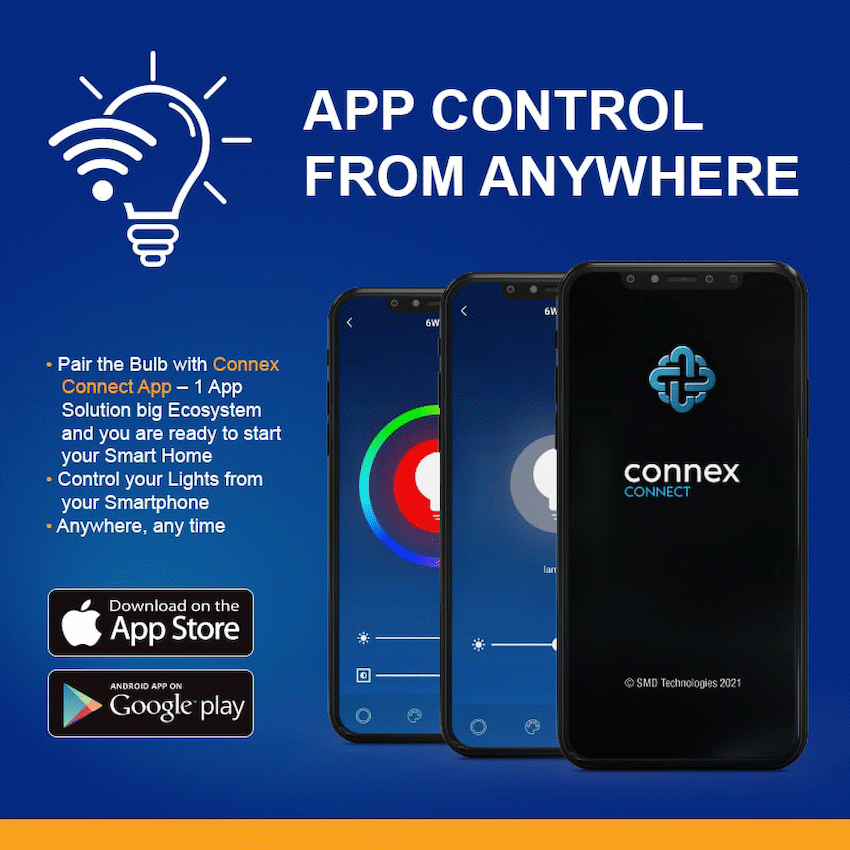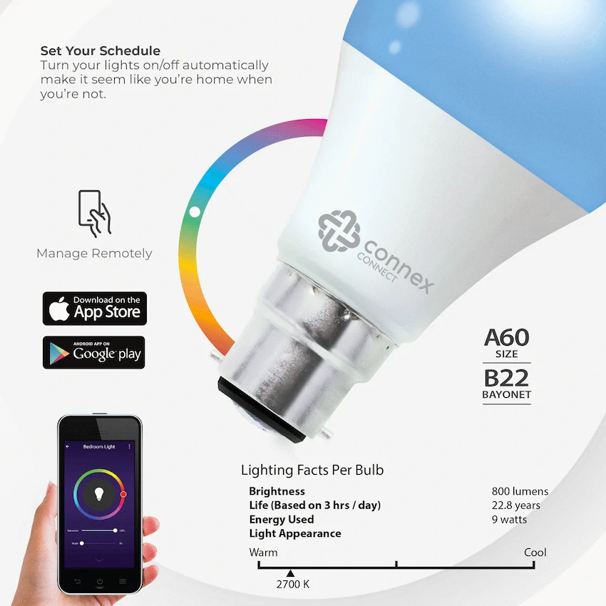 Efficient LED Smart lighting, saving 90% energy, sharply decrease your electricity costs. RGB Colours: Select 16 Million Colour Options. Bulb Type: Bayonet Sharing: Share bulb access with family or colleagues, allowing multiple people to manage the smart lighting.Colour Option Colour LED lighting 16 Million Colour Options.Voice Control Go hands-free with Amazon Alexa and Google Assistant. Turn on/off lights via voice command. Especially convenient when your hands are full.Features::Sharing Lighting Share control of lights with trusted family members or share individual lights with work colleagues.Security Trigger Smart Tech lighting devices when your Motion, Door, Camera sensors detect movement or noise. Turn on lights, flashing red to scare away intruders.Grouping Group multiple Smart Tech lights to operate together or to manage via Voice assistant.Easy Installation Getting one or multiple lights set up around your house is easy. All you need is a Wi-Fi connection and a Smart Tech LED light bulb. Pair the Smart Light to your home network and access it immediately from the Connex Connect app.What’s in the box1 x LED Bulb