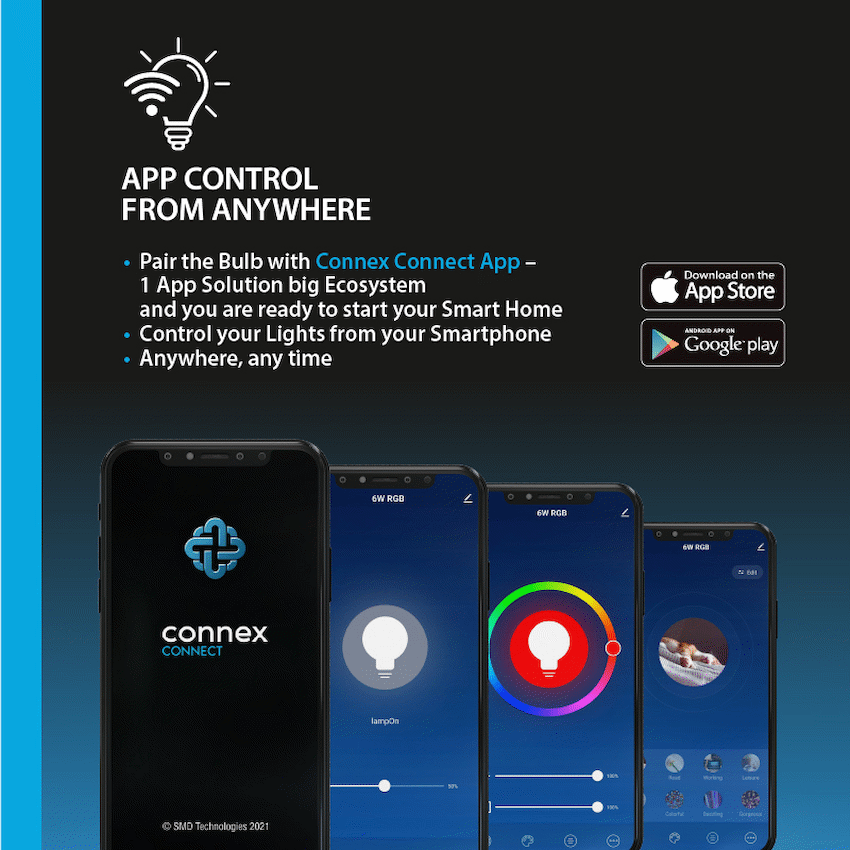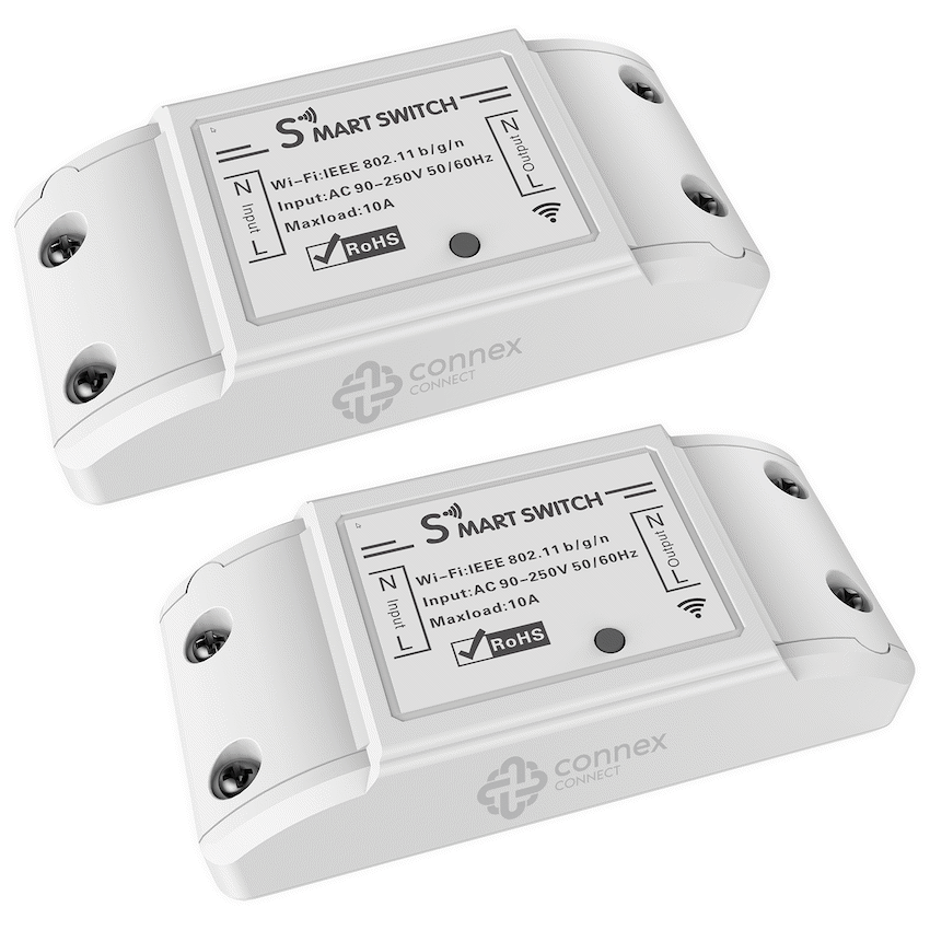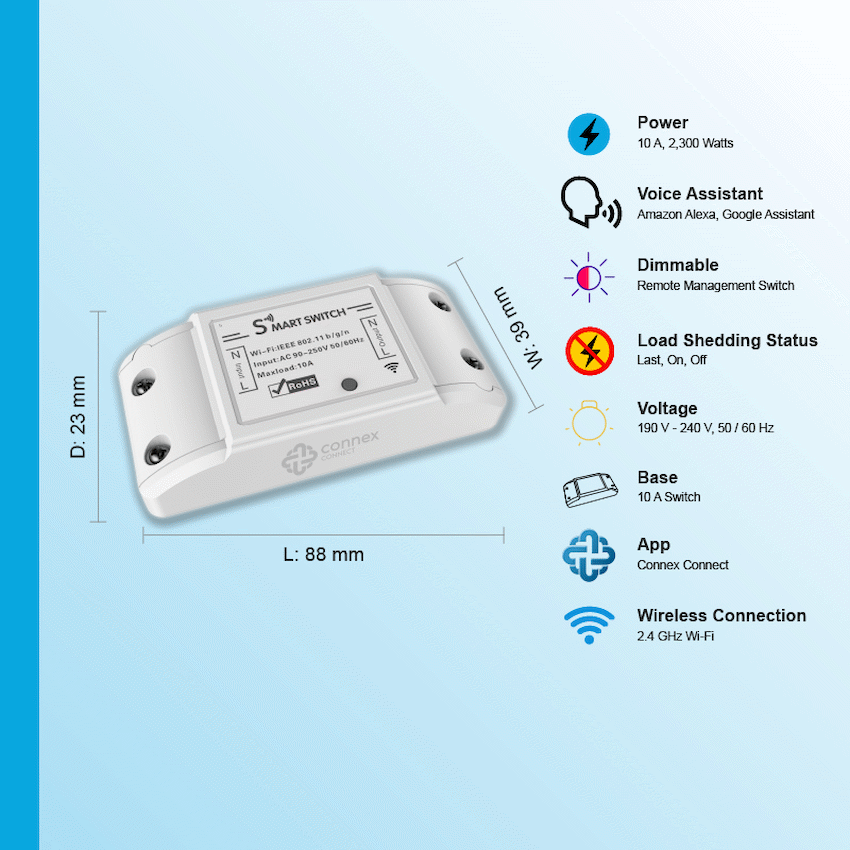 Make your home a Smart Home and manage your plugs (yes, even after loadshedding) with the Connex Connect Smart WIFi Switch. Turn your various electronic devices or appliances on and off remotely – boil the kettle or turn on your lamps before you even get home! Use 2.4Ghz WiFi on your Mobile via the Connex Connect APP to control the Smart Switch which also works with Alexa and Google Assistant. Set timers, schedules and group/share with your other Connex Connect Plugs to simplify and add luxurious convenience to your day-to-day life.Easy DIY installation and connection makes the process simple from the get go and you can rest easy with a limited 1 year Warranty against manufacturing faults. 10A Switch with 2300W and ICASA as well as NRCS Approved with Local In-App Support.Special Features:- 2,300W- 10A Max Load- Control any Device- Manage your Plug after Loadshedding (On/OFF/Last State)- Support for Alexa & Google Voice Assistant- Manage your Plugs with 2.4Ghz WiFi on your Mobile via Connex Connect APP- Easy DIY installation and connection with 1 year Warranty- ICASA and NRCS Approved with Local In-App SupportSpecifications:- App: Connex Connect- Technology: LED & WiFi- Connectivity: WiFi 802.11bgn- 2.4 GHz (WiFi 4)- Max. Load: 10 Amps- Voltage In: 220 / 240V-Plug Control: Turn On & Off withTimer- Materials: PVC, V0 Fireproof- 1 Year WarrantySystem Requirements:- Mobile Device running iOS 8 orhigher or Android 4.1x or higher- Connex Connect App- Existing 2.4GHz WiFWhat’s in the box2 x Connex Connect Smart WiFi Switch Plug – 10A, 2300W1 x Gift Box1 x Instruction Manual1 x Voice Assistant Guide