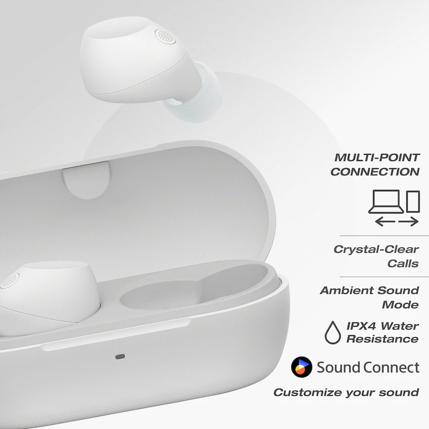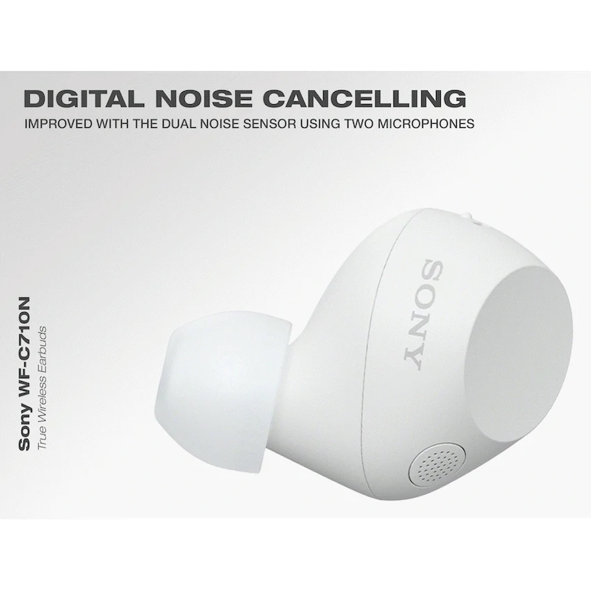 WF-C710N Wireless Noise Canceling Earbuds are the ultimate everyday audio essential with optimal noise canceling abilities.Enjoy all-day comfort with up to 8.5 hours on headphones and up to 21.5 hours in the case.1Crystal-clear calls with voice pickup that utilizes AI technology.Enjoy high quality sound with Sony’s unique 5 mm driver and Digital Sound Enhancement Engine processing (DSEE).Choose between four timeless colors including Glass Blue, Pink, White, and Black.6Enjoy more of your music with Advanced Noise Canceling and Dual Noise Sensor technology.Stay connected to your environment with Ambient Sound Mode through dual mics.Adjust your ambient sound in 20 levels or use the Focus on Voice setting to chat without removing your headphones through Sony | Sound Connect App.3Customize your sound with presets or create your own using the EQ Custom feature in the Sony ? Sound Connect app.3Enjoy your music in an effortless way with simple taps as a shortcut to your music.Pair with two compatible Bluetooth(R) devices simultaneously using Multipoint Connection, automatically switch between devices when it’s convenient for you