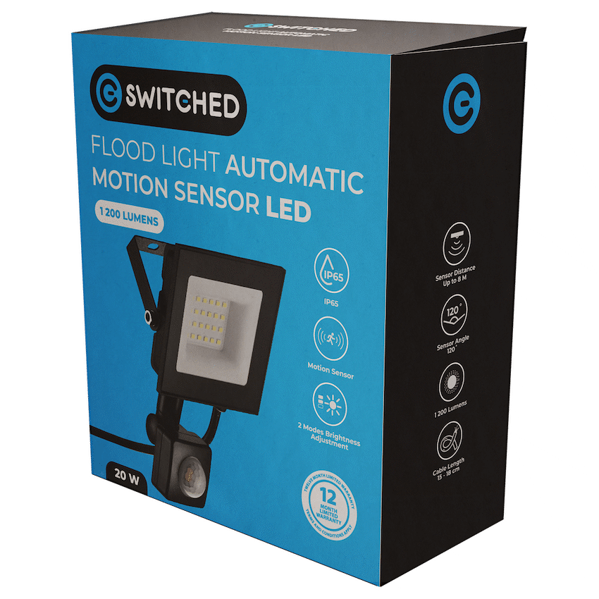 Enhance your home’s safety and visibility with the Switched 20W LED Motion Sensor Flood Light-a durable and efficient LED motion sensor flood light designed for South African weather conditions. Delivering a bright 1600 lumens of cool white light (6500K), it’s perfect for driveways, gardens, garages, and perimeter walls.The built-in PIR motion sensor detects movement up to 8 metres away with a 120deg angle, automatically switching the light on when motion is detected. Adjustable settings allow you to control sensitivity, delay time (5-900 seconds), and lighting mode. Choose between “Night Only” operation or “All Day” mode for customised convenience.Built tough with an IP65 waterproof rating, this outdoor security light South Africa is engineered to perform rain or shine. Easy to install and energy-efficient, this waterproof motion sensor light is ideal for homes, offices, and small businesses looking for reliable automatic lighting.