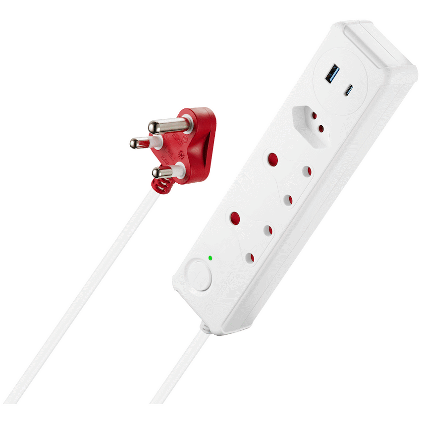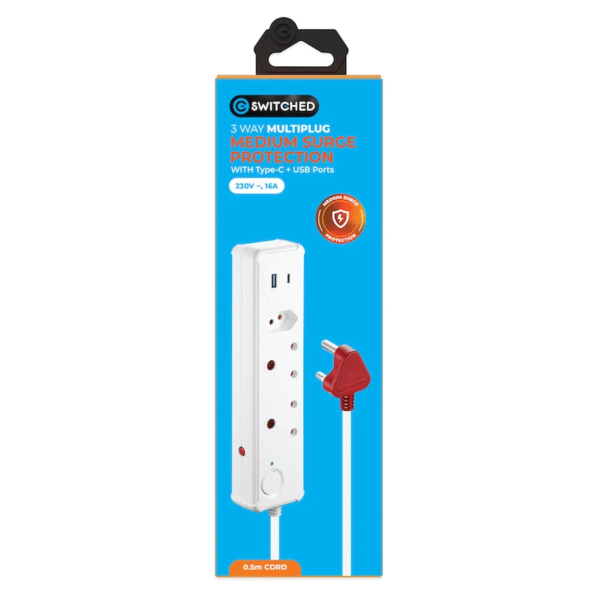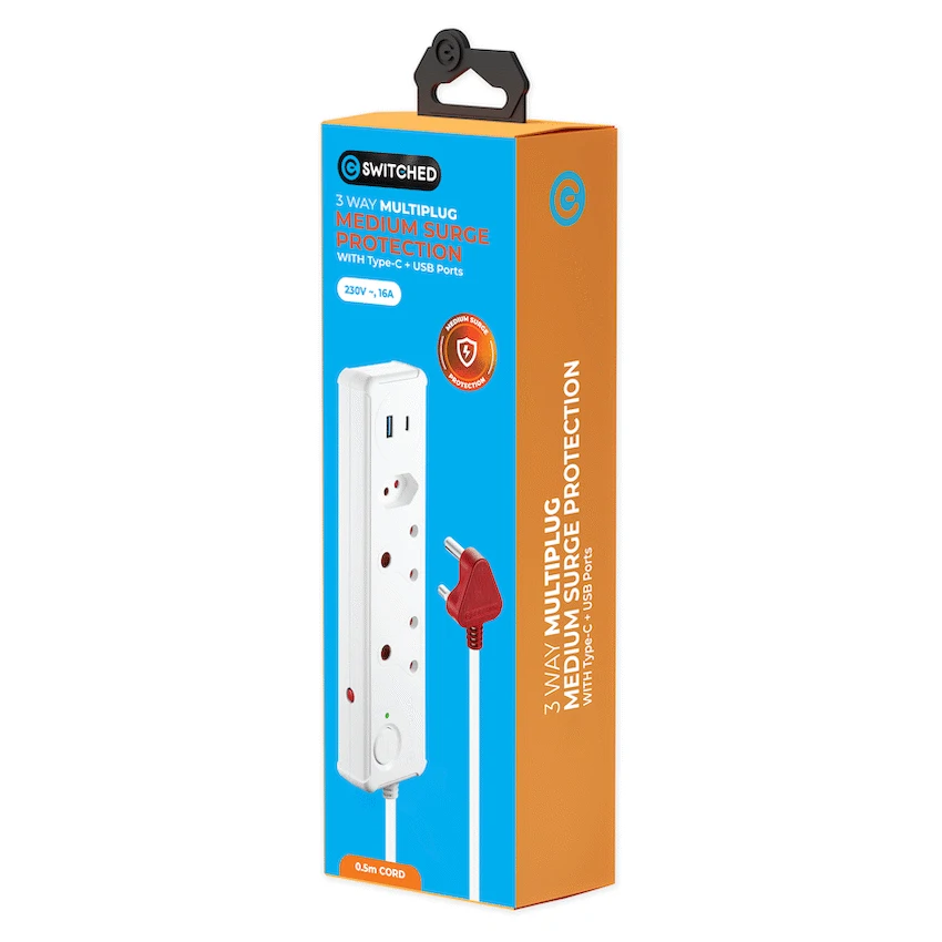 Power and protect your devices efficiently with the Switched 3-Way Medium Surge-Protected Multiplug in white. It features two 16A 3-pin sockets, one 16A SANS 164-2 socket, and high-speed USB charging with 1x Type-C and 3.4A total USB output, making it perfect for both appliances and mobile devices. Built-in safety shutters, medium surge protection (375J), and overload protection with reset button ensure maximum safety. With a 0.5m durable PVC cord and 3680W max load, it’s ideal for home or office use. Box includes: 1 x 3-Way Medium Surge-Protected Multiplug with Type-C + USB Ports, ready to safely power and charge your devices.