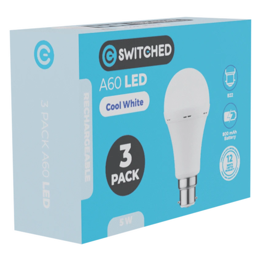 Brighten up your home even during power outages with the Switched 5W A60 Rechargeable B22 LED Light Bulb (3 Pack). Each rechargeable light bulb automatically switches to battery power during a power cut, giving you up to 2 hours of continuous light-perfect for South African load-shedding conditions.Emitting a clean 4000K cool white light, these bulbs offer clarity and brightness ideal for kitchens, hallways, and offices. The built-in 800mAh lithium battery recharges in 4-5 hours and provides dependable illumination whenever the power goes out.With 350 lumens of brightness on AC and 210 lumens on DC mode, this emergency light bulb South Africa set ensures consistent, energy-efficient performance. Each Switched rechargeable bulb has a 15,000-hour LED lifespan, offering durability and peace of mind for years of reliable use.