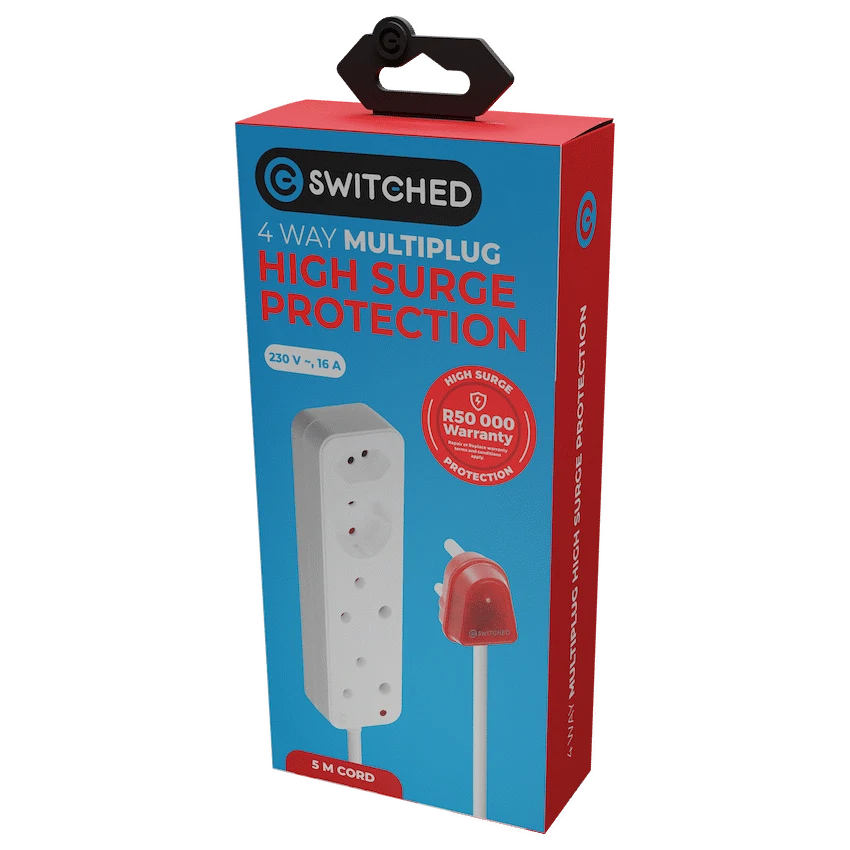 Protect your appliances and electronics from damaging power spikes with the Switched High Surge 4-Way Multiplug. This 4-way surge protector multiplug is equipped with 1140 Joules of surge protection and supports various socket types, making it an ideal choice for compact setups and high-use areas like desktops, TV stands, or kitchen counters.Built with South African households in mind, it offers overload protection with a manual reset button, safety shutters for child safety, and a solid, durable build. Whether you’re powering a laptop, speaker, router, or other everyday devices, it ensures peace of mind during load shedding and electrical fluctuations.The short 0.5m cord keeps cable clutter to a minimum while providing just enough flexibility to extend power from tight or close-range sockets.
