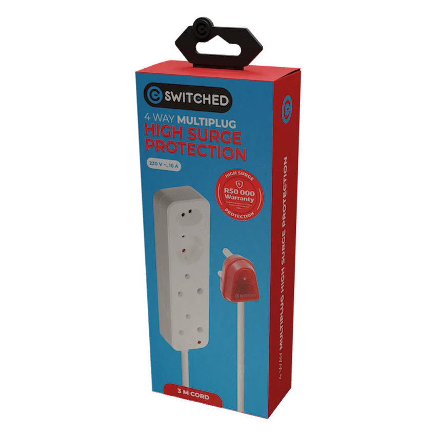 Power your home or office essentials with the Switched High Surge 4-Way Multiplug, designed to offer safe, efficient performance in South Africa’s demanding power environment. With 1140 Joules of high surge protection, this 4-way surge protector multiplug shields your electronics from damage during power spikes caused by load shedding, storms, or voltage fluctuations.Featuring overload protection with a manual reset button, it automatically cuts off when electrical current exceeds safe levels. The built-in safety shutters ensure child safety and peace of mind. With support for 3-pin, SANS 164-2, and Schuko plugs, it’s compatible with most appliances and devices in South African homes.The 3-metre extension cord gives you more flexibility when sockets are just out of reach-perfect for desks, lounges, or appliance-heavy kitchens.