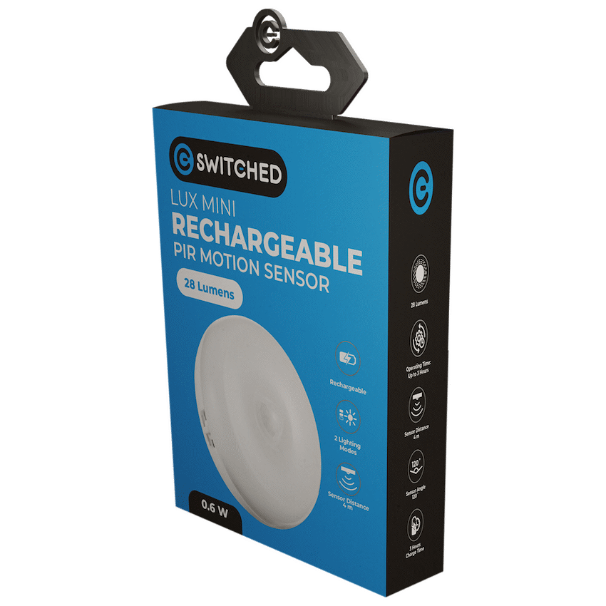 Light up your home effortlessly with the Switched Lux Mini Rechargeable Motion Sensor Night Light – the ultimate blend of smart tech and convenience. This compact, USB rechargeable light offers portable, wire-free illumination, perfect for hallways, closets, bedrooms, or any dim corner of your home.Featuring a built-in PIR sensor, the LED motion sensor light activates automatically when it detects movement within 4 meters, casting a soft 28-lumen glow that lasts just long enough (30 seconds) to guide your way without wasting power. With 3 lighting modes-Auto (sensor-based), On (constant), and Off-you have total control over how and when the light operates.The rechargeable motion sensor light runs up to 3 hours on a full charge and recharges easily via Micro USB. Its magnetic back and included mounting accessories (metal plate, 3M tape, and screws) make installation quick and drill-free-just stick, mount, and go. Despite its powerful features, it remains sleek and lightweight, perfect as a mini night light for any room.