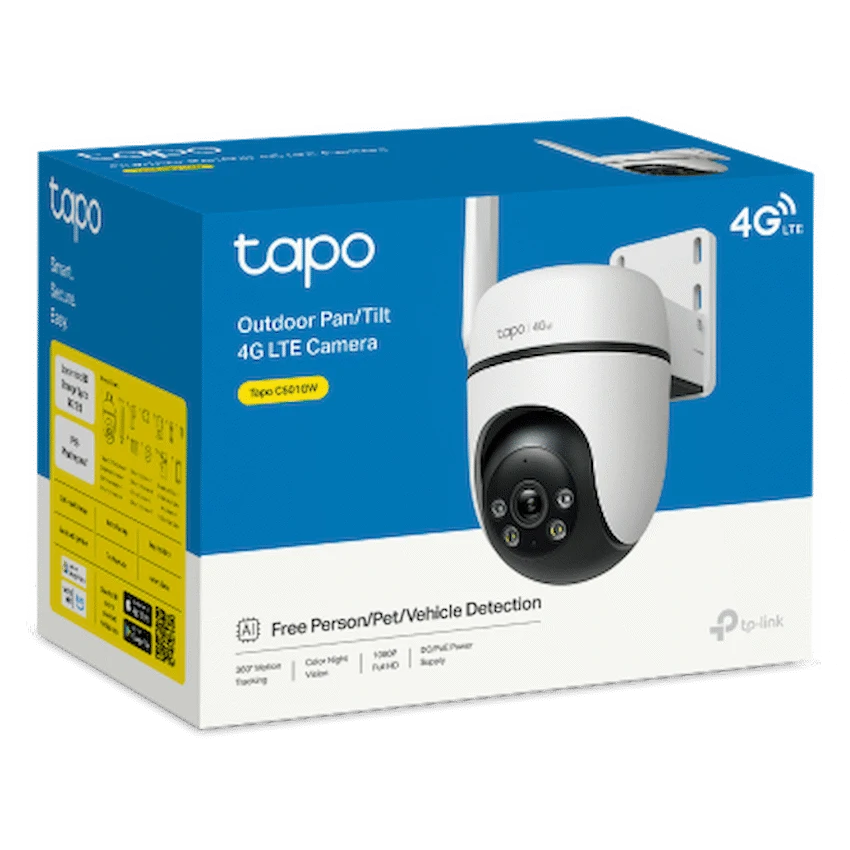 Meet the Tapo C501GW – a robust outdoor pan/tilt security camera built for places without stable Wi-Fi. Whether it’s a farm, vacation home, warehouse, or remote site, this camera keeps you connected via 4G LTE or PoE – no reliance on wireless networks.With 360deg horizontal rotation and 130deg vertical tilt, the C501GW watches your entire scene and can patrol preset points automatically. Video is streamed in Full HD 1080p, giving you crisp, recognizable details. Intelligent AI detection recognises people, pets, vehicles, tampering, and line crossings – sending alerts only for what matters.At night, the camera’s starlight color night vision and built-in spotlights deliver vivid, clear images even in low light. The dual-mode alarm (sound + light) adds a layer of deterrent. With IP66 weatherproofing and a wide operating temperature range, it’s engineered to endure harsh outdoor conditions.You can store footage locally on a microSD card (up to 512 GB) or opt for the Tapo Care cloud service. Dual power options (12 V DC or PoE 802.3af/at) give you flexible installations.