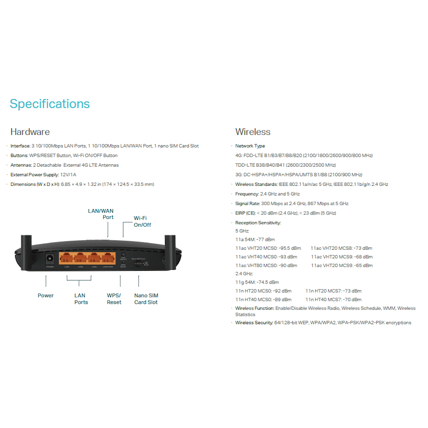 TP-Link Archer MR400 AC1200 Wireless Dual Band 4G LTE RouterAC1200 Wireless Dual Band 4G LTE RouterArcher MR400Cutting-edge 4G network – share internet access with up to 64 Wi-Fi devices and enjoy download speeds of up to 150 MbpsAC1200 Wi-Fi – creates simultaneous dual band Wi-Fi networks, with maximum speeds of up to 300 Mbps on the 2.4 GHz band and 867 Mbps on the 5 GHz bandPlug a SIM card and play – no configurations needed, compatibility for SIM cards in 100+ countries are assured by years of field testsTwo detachable advanced LTE antennas – enjoy stable and efficient connections to every device thanks to the two external antennasWi-Fi router mode – plug an Ethernet cable into the LAN/WAN port for flexible access as a backup option if you can’t get a 4G connection4G LTE with AC1200 Wi-Fi to Stream from EverywhereAC1200 Wireless Dual Band 4G LTE Router – Archer MR400Got SIM Card?Then Plug and Play!With an integrated 4G LTE modem and a built-in SIM card slot, all you need to do is insert a micro SIM card and turn on the Router. Enjoying fast, stable Wi-Fi on a 4G LTE network has never been easier.Share Your 4G LTE NetworkTake full of advantage of your cutting-edge 4G LTE network for download speeds of up to 150 Mbps. Share your 4G LTE network with multiple Wi-Fi devices and enjoy uninterrupted HD movies, rapid file downloads, and smooth video chats. Fully compatible with FDD-LTE and TDD-LTE to work with most service providers worldwide.Wi-Fi Where You Need ItEnjoy unmatched convenience and versatility. Tested in the field for years to ensure universal compatibility with 2 advanced LTE antennas to deliver a smooth connection. Simply plug in a micro SIM card and power on this elegant piece of technology to utilize fast and stable Wi-Fi, whether you’re at home or working remote.Internet Access forup to 64 Devices SimultaneouslyEasily share a 3G/4G connection with up to 64 wireless devices, such as phones, tablets, and laptops, at the same time. 4 LAN ports stand ready to provide internet for wired devices like desktop computers.Easy Setup and ManagementSet up the Archer MR400 in minutes thanks to its intuitive web interface and the powerful Tether app. Tether also lets you manage its network settings from any Android or iOS device, including parental controls and access control.SpecificationsHardware FeaturesInterface : 3 10/100Mbps LAN Ports, 1 10/100Mbps LAN/WAN Port, 1 Micro SIM Card SlotButton : WPS/Reset Button, WiFi On/Off Button, Power On/Off ButtonExternal Power Supply : 12V/1ADimensions ( W x D x H ) : 7.95 x 5.55 x 1.32 in. (202 x 141 x 33.6 mm)Antenna : V2: 2 Internal 4G LTE AntennasV3/V1: 2 Detachable 4G LTE AntennasWireless FeaturesWireless Standards : IEEE 802.11ac/n/a 5GHz, IEEE 802.11b/g/n 2.4GHzFrequency : 2.4GHz and 5GHzSignal Rate : 300Mbps at 2.4GHz, 867Mbps at 5GHzReception Sensitivity : 5GHz: 11a 54M: -74dBm11ac HT20: -67dBm11ac HT40: -64dBm11ac HT80 : -60dBm11n HT20: -71dBm11n HT40: -70dBm2.4G: 11g 54M: -76dBm11n HT20: -73dBm11n HT40: -67dBmTransmit Power : CE: Wireless Functions : Enable/Disable Wireless Radio, WMM, Wireless StatisticsWireless Security : 64/128-bit WEP, WPA/WPA2, WPA-PSK/WPA2-PSK encryptionsNetwork Type (V2)Network Type : 4G: FDD-LTE B1/B3/B7/B8/B20 (2100/1800/2600/900/800MHz)TDD-LTE B38/B39/B40/B41 (2600/1900/2300/2500MHz)3G: DC-HSPA+/HSPA+/HSPA/UMTS B1/B8 (2100/900MHz)Software FeaturesQuality of Service : Bandwidth ControlOperating Modes : 3G/4G Router, Wireless RouterWAN Type : Dynamic IP/Static IP/PPPoE/PPTP(Dual Access)/L2TP(Dual Access)Management : Access Control, Local Management, Remote Management,reboot scheduleDHCP : Server, Client, DHCP Client List, Address ReservationPort Forwarding : Virtual Server, Port Triggering, UPnP, DMZDynamic DNS : DynDns, NO-IPVPN : PPTP VPN, IPSec VPN , OpenVPNAccess Control : Parental Control, Local Management ControlFirewall Security : DoS, SPI Firewall, IP Address Filter/Domain Filter, IP and MAC Address BindingProtocols : Supports IPv4 and IPv6Guest Network: 2.4GHz guest network x 1, 5GHz guest network x 1IPSec VPN : Supports up to 10 IPSec VPN tunnelsOthersCertification : CE, RoHSSystem Requirements : Microsoft Windows 98SE, NT, 2000, XP, VistaTM or Windows 7, 8, 8.1, 10MAC OS, NetWare, UNIX or LinuxInternet Explorer 11, Firefox 12.0, Chrome 20.0,Safari 4.0 browsers or higher, or other Java-enabled browsersMicro SIM CardEnvironment :Operating Temperature: 0?~40? (32? ~104?)Storage Temperature: -40?~70? (-40? ~158?)Operating Humidity: 10%~90% non-condensingStorage Humidity: 5%~90% non-condensingWhat’s in the boxAC1350 Wireless Dual Band 4G LTE Router, Archer MR400RJ45 Ethernet CablePower AdapterQuick Installation GuideMicro to Standard SIM Card AdapterNano to Standard SIM Card Adapter